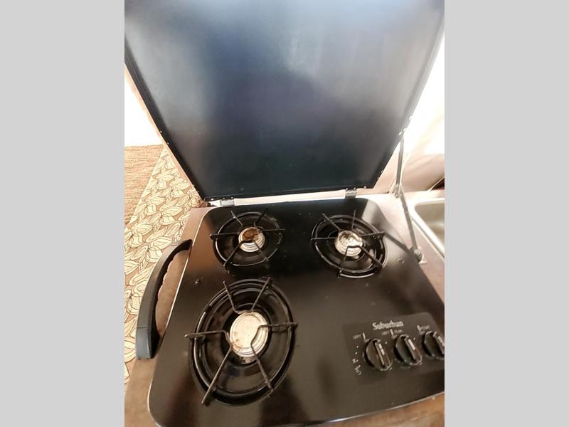 As you enter the camper, to the left there is a gaucho/bed. To the right of the entrance you will find a cabinet or an optional shower/port-a-potty. The opposite side has a sink, three burner range, optional refrigerator, dinette slide, and cabinet.