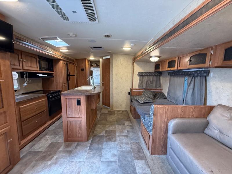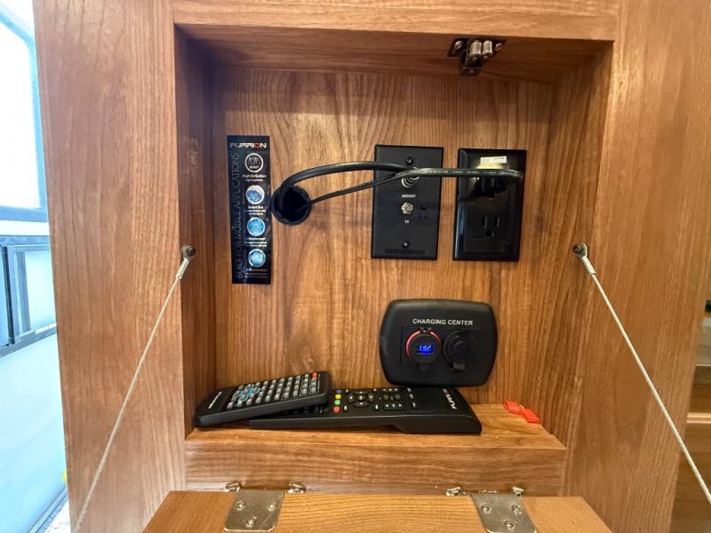 What I liked most: Because of its hybrid drop down queen beds and slide-outs it is quite compact when towing but quick set-up produces a very roomy interior with an island in kitchen with two bedroom areas. Handles extremely well and is great to tow with its torsion bar suspension and dual wheels. Refrigerator and bathroom is roomy, beds are very comfortable with heated mattresses for late season camping. Quality of cabinetry in solid hardwood ( cherry, hickory or maple) with hardware and finishes cannot be surpassed. No pressed wood anywhere in this unit. LED lighting is excellent and easy on battery power if needed. Good sound system outside and in with full bluetooth. Plentiful storage with lots of exterior cubbies. Well insulated and very quiet.