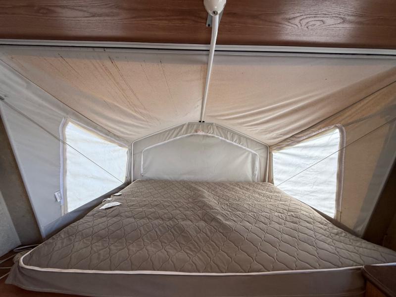 Front and rear queen tent end beds offer a shelf above the opening for extra storage. A nightstand is next to the front bed with a lower shelf included as you enter the rear bed.