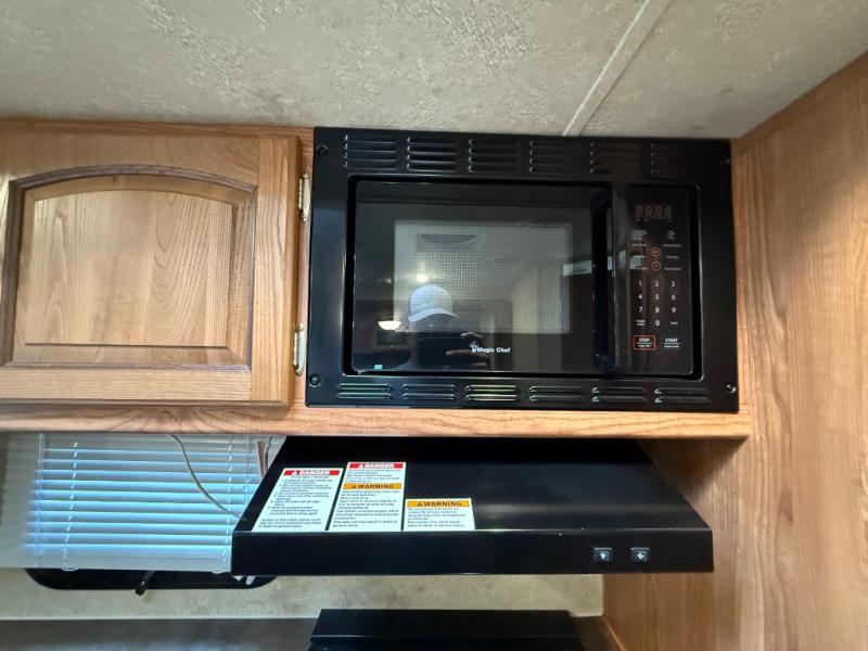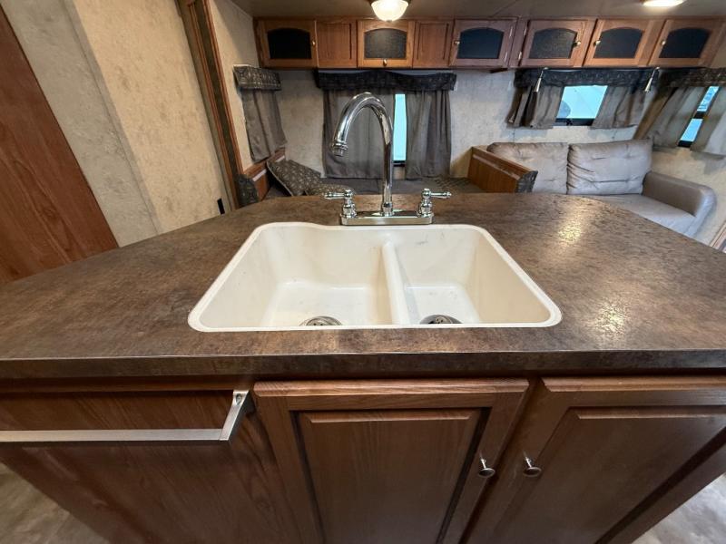 The double slide Flagstaff Shamrock 23IKSS offers a kitchen island and plenty of space for sleeping or playing in this expandable travel trailer.