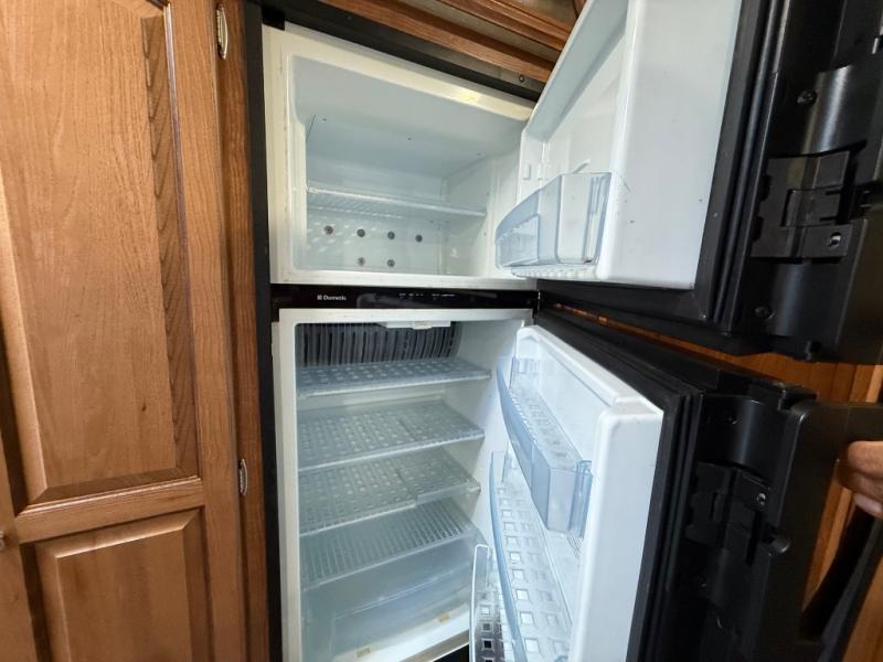 Two wardrobes are located across from the bath. An island with double kitchen sink sits in front of a slide out featuring a pantry, refrigerator, overhead cabinets, countertops, three burner stove top, and overhead microwave. An entertainment center is located along the wall just before you reach the entry door.
