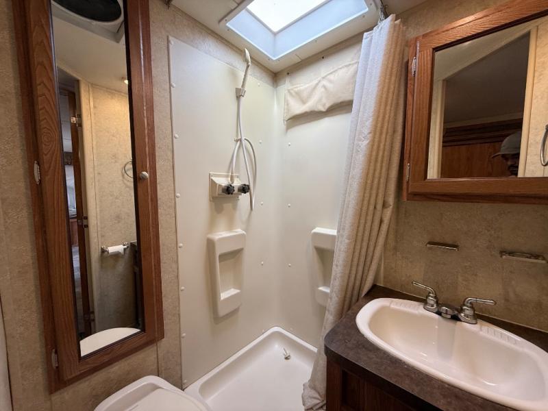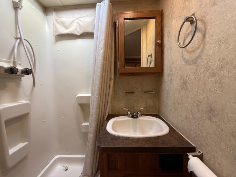 One slide out has a 58" sofa, 44" booth dinette and full length overhead cabinets. Continuing around, there is a rear corner bath. The bathroom includes a vanity sink, medicine cabinet, corner shower, toilet and linen storage.