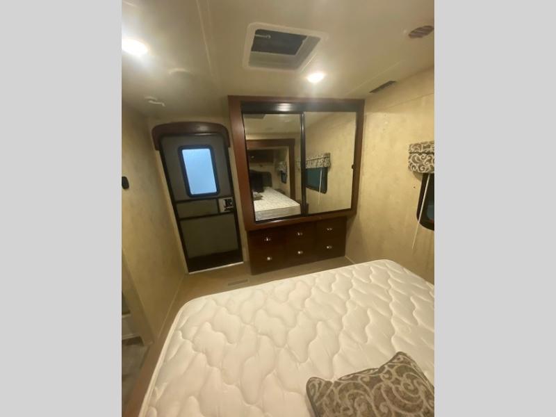 In the rear, you will find a queen bed slide, optional wall mount TV, and a large wardrobe. There is also a private entrance door leading outside from the bedroom.