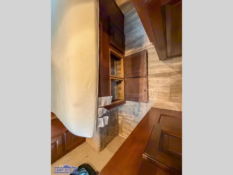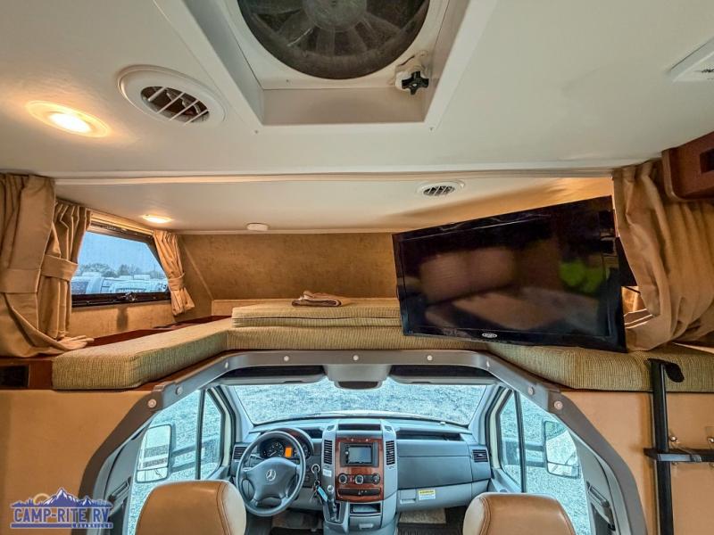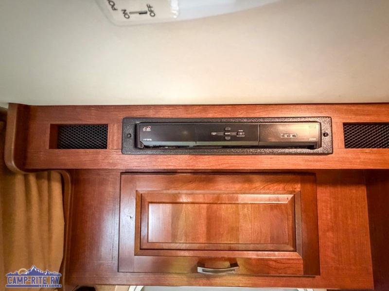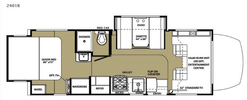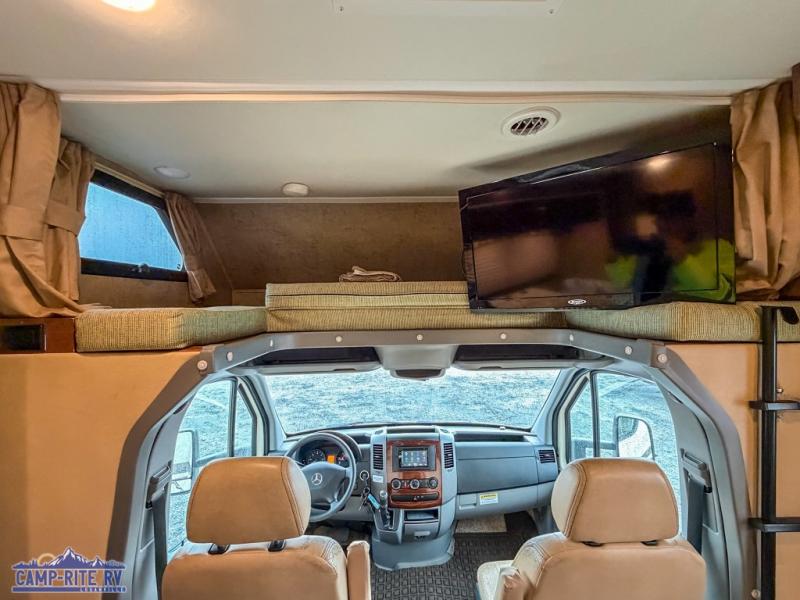 As you enter the motor home, above the cab you will see a 54" x 80" bunk or you can choose an optional entertainment center. In the corner of the cab there is an optional deluxe TV.