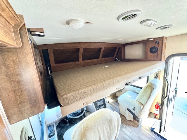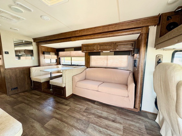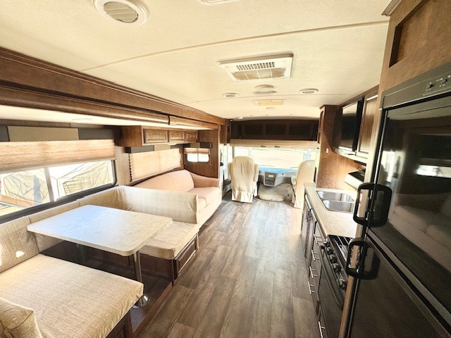 As you enter the motor home, on the left there is a double kitchen sink, 32" LED TV, three burner range, microwave, and refrigerator. The other side of the motor home offers a slide with a hide-a-bed sofa with footrests and a wrap-around booth dinette.