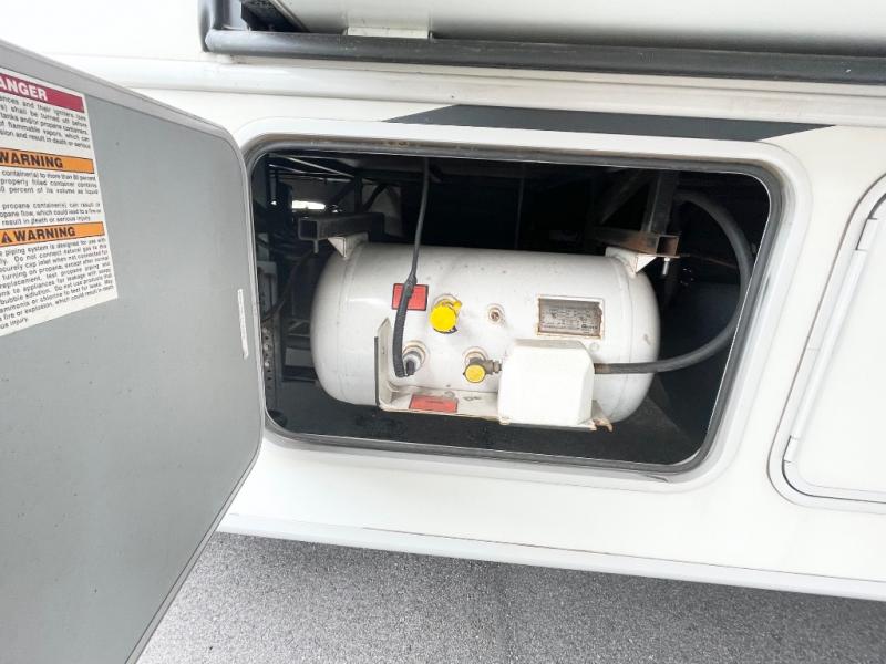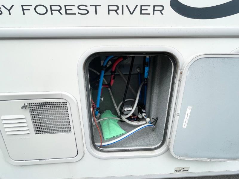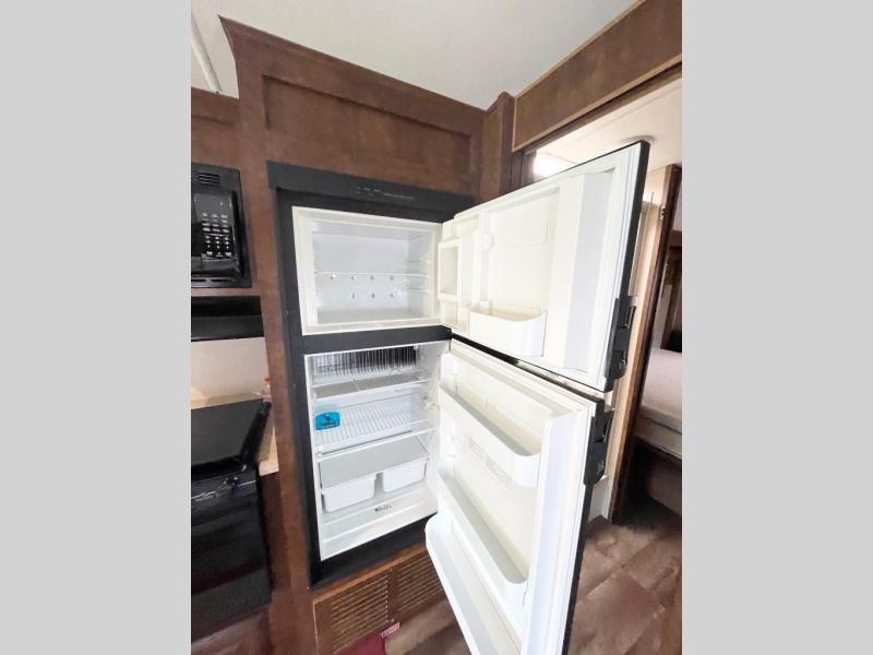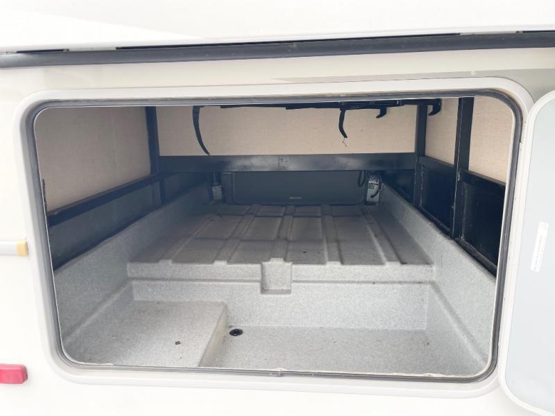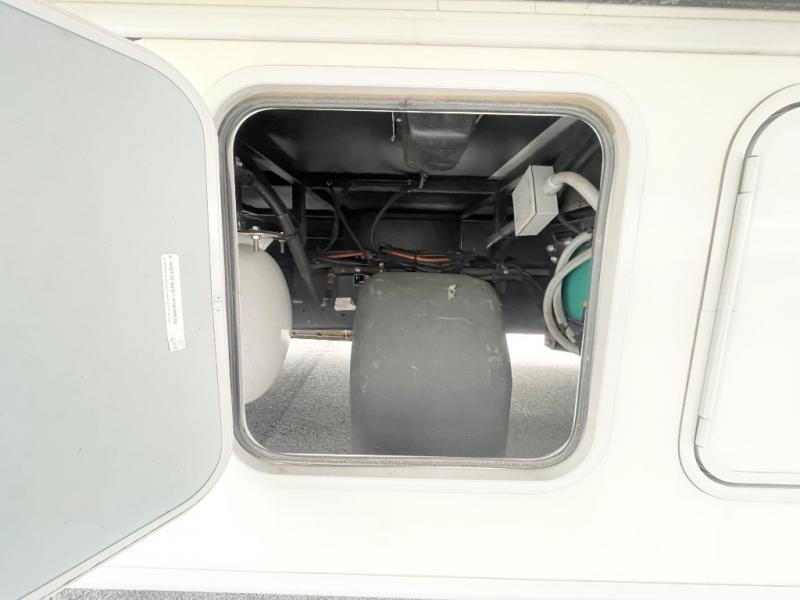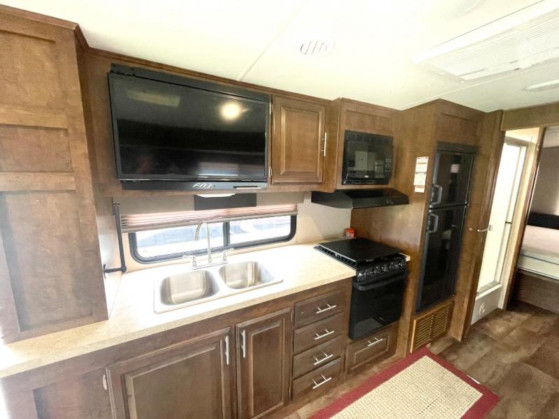 As you enter the motor home, on the left there is a double kitchen sink, 32" LED TV, three burner range, microwave, and refrigerator. The other side of the motor home offers a slide with a hide-a-bed sofa with footrests and a wrap-around booth dinette.