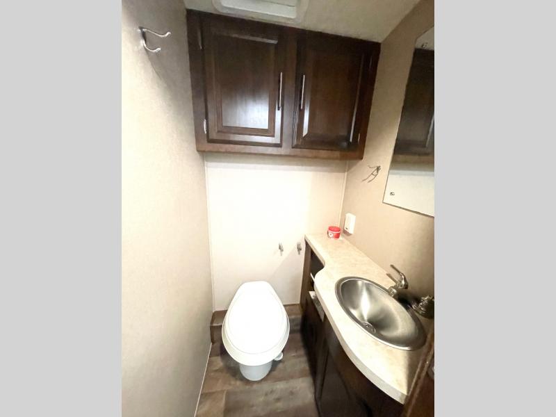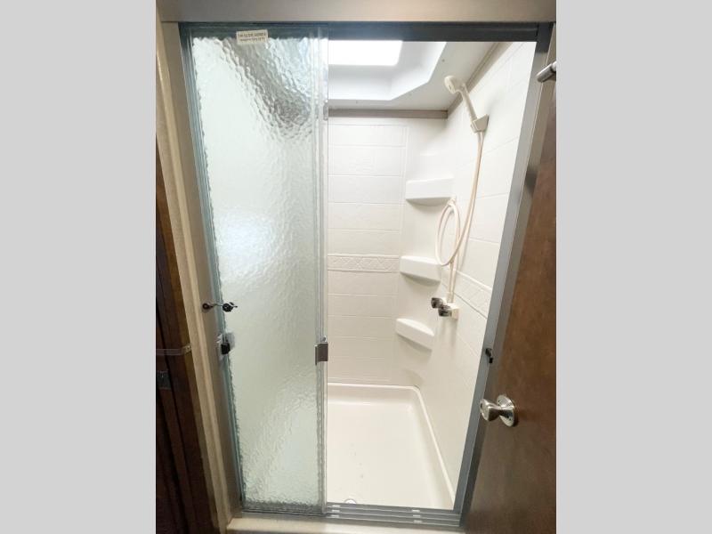 The bathroom has a private toilet area with a sink on one side of the motor home and a shower on the other side.