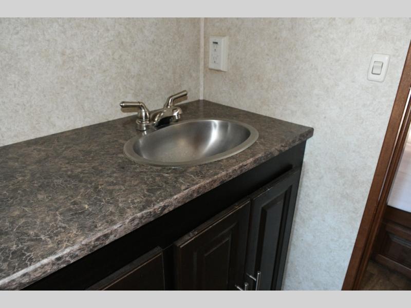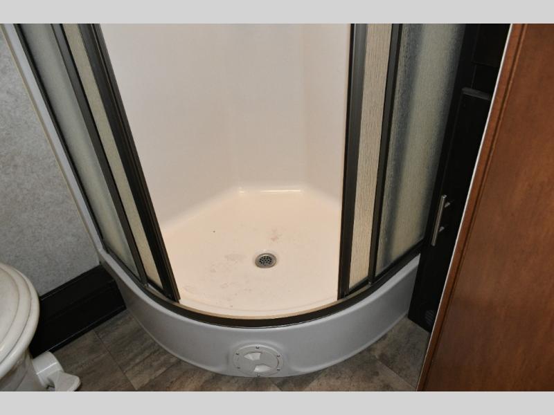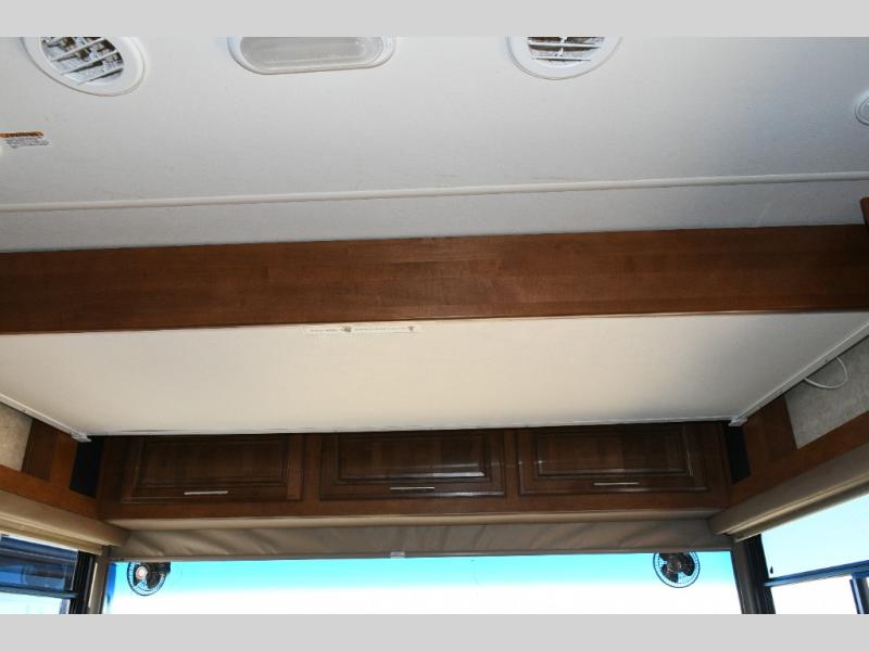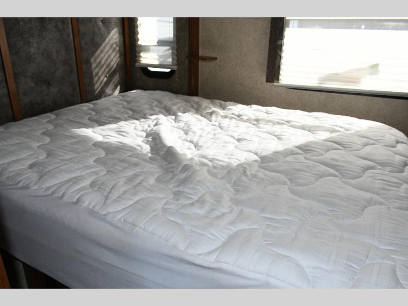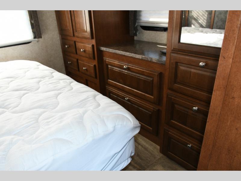 Queen bed slide-out, dual wardrobes, overhead cabinets, and plenty of storage for extended trips. -