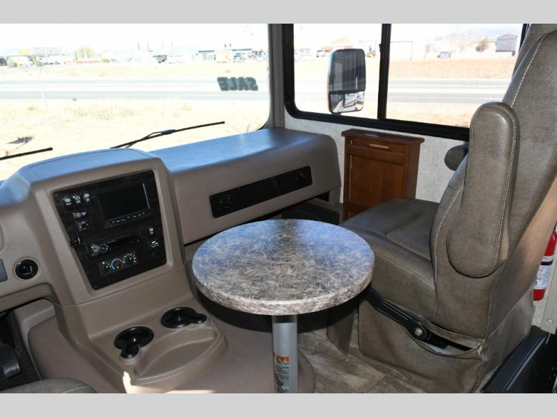 Round pedestal table between driver and passenger seats for quick snacks or game nights. -