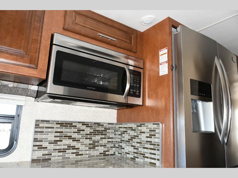 Double stainless steel sink, three-burner range, microwave, refrigerator (or optional residential fridge upgrade), pantry, and ample counter space.
