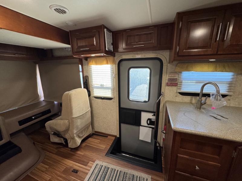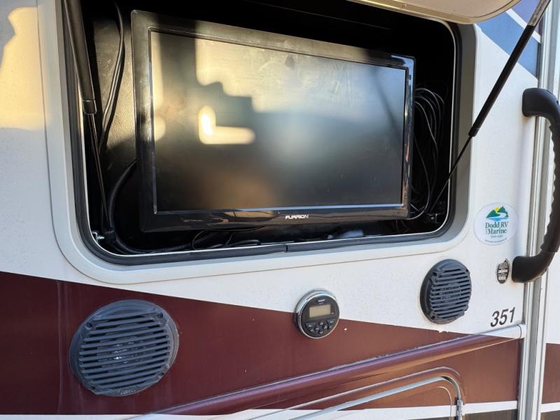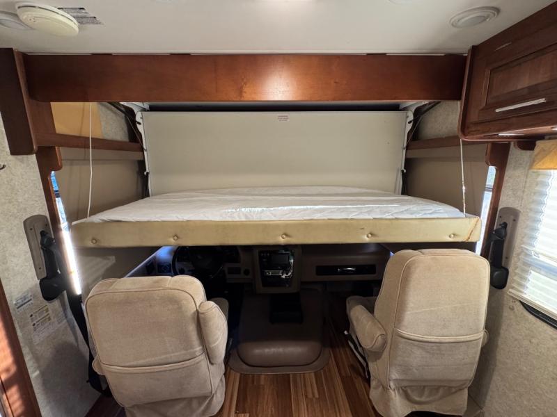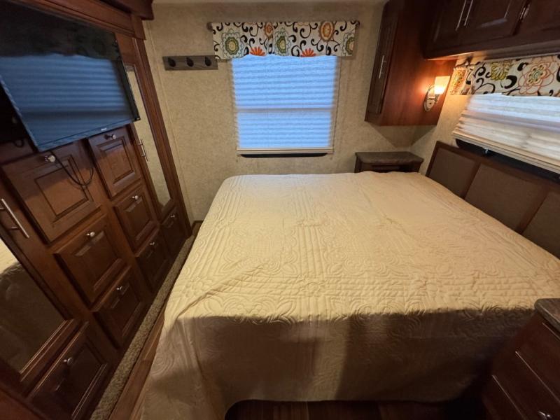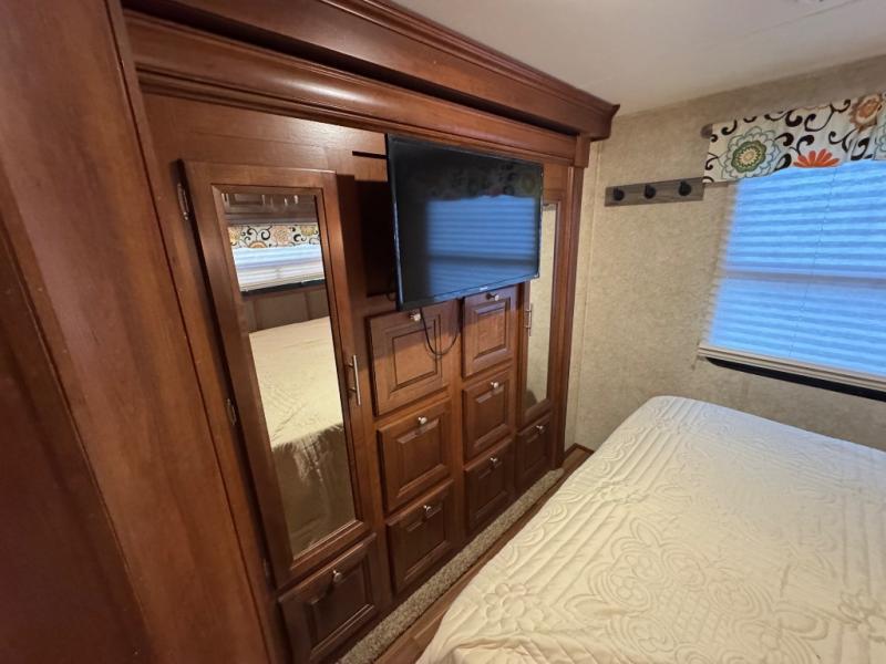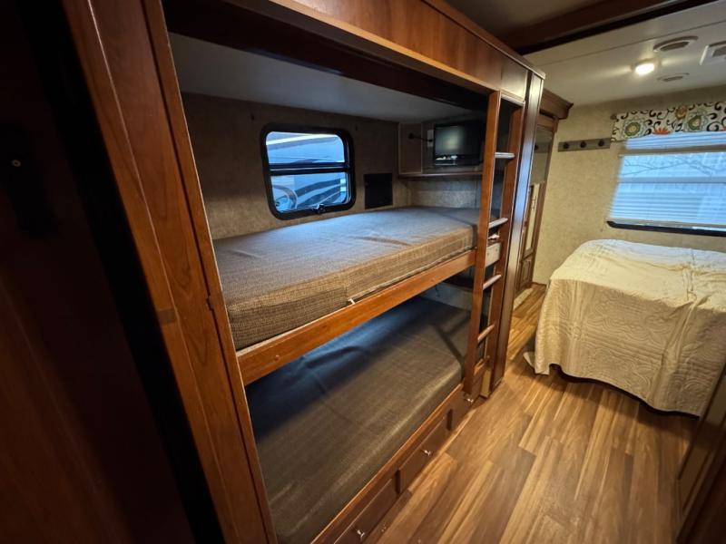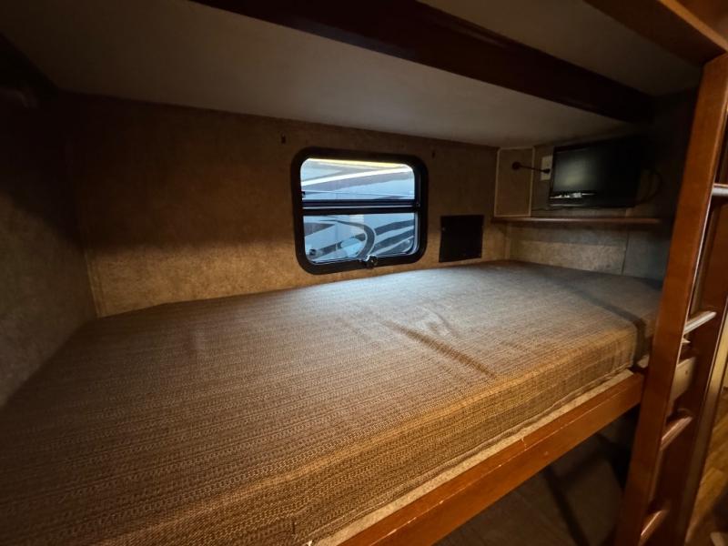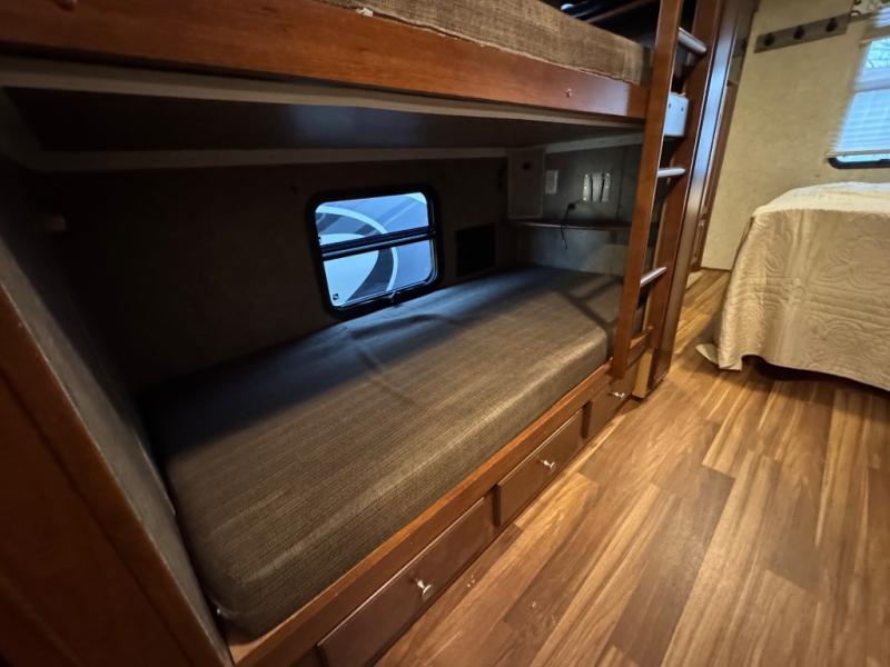 The Georgetown 351DS motor home by Forest River is unique in the fact that it offers bunk beds. The rear bedroom has a queen bed and wardrobe. On the opposite side, you will find a TV, wardrobe, and bunk bed slide.