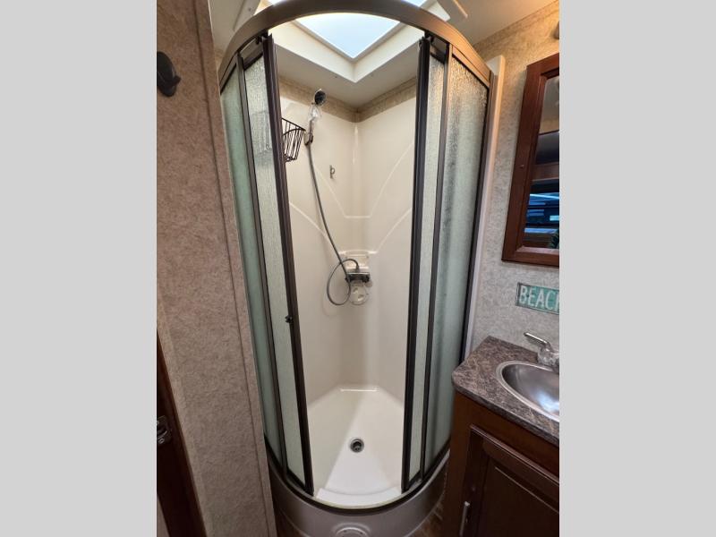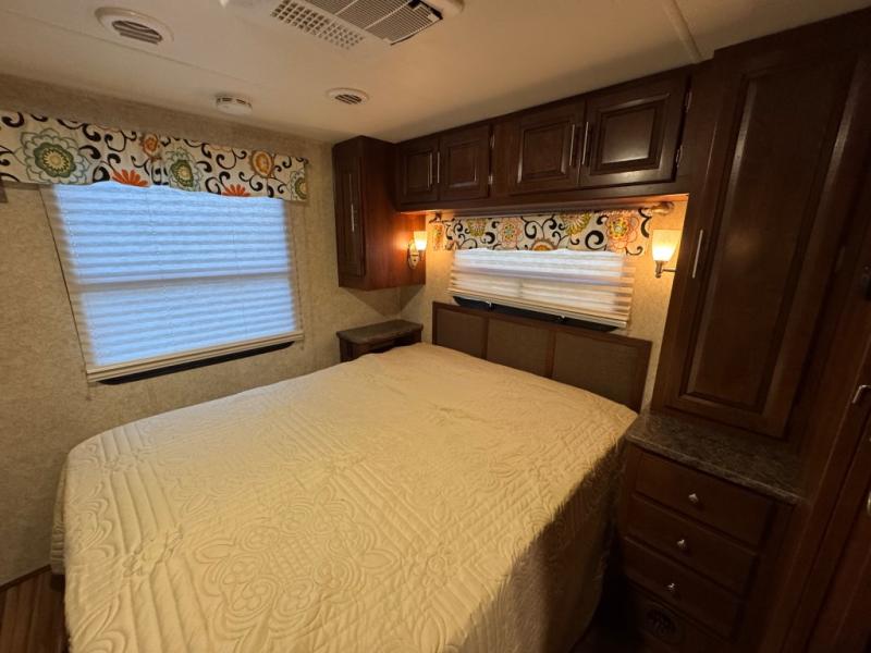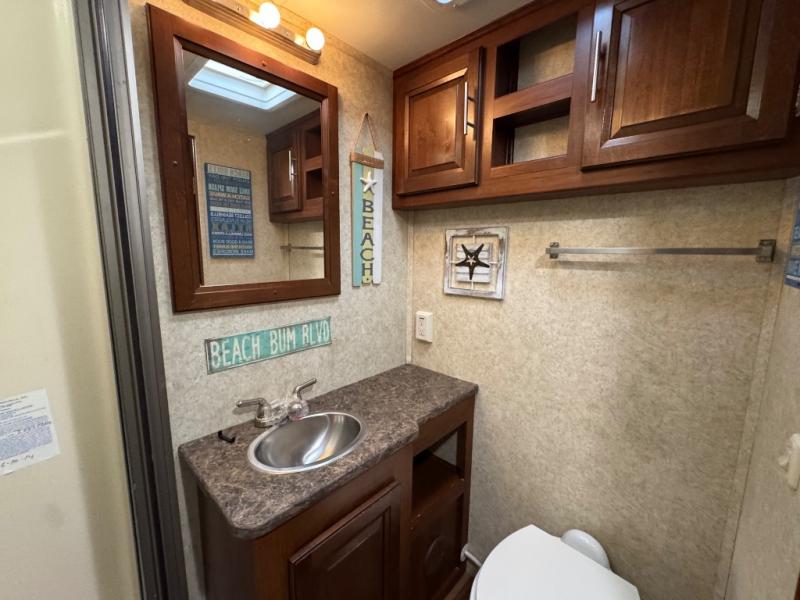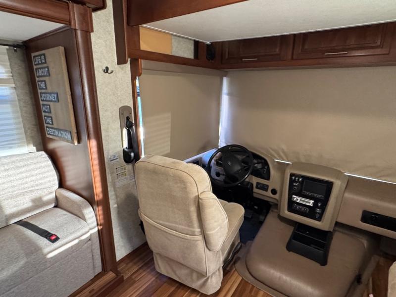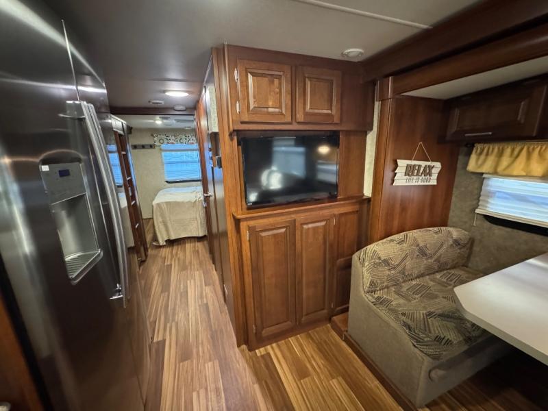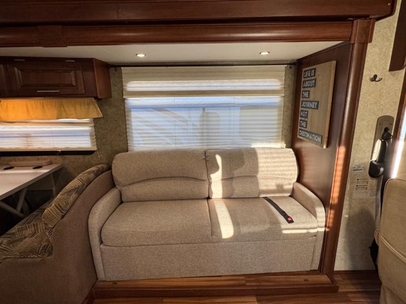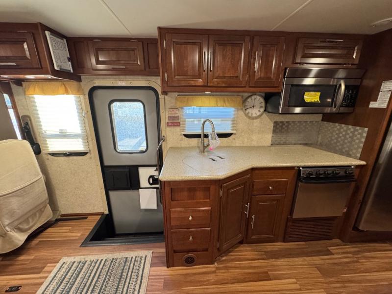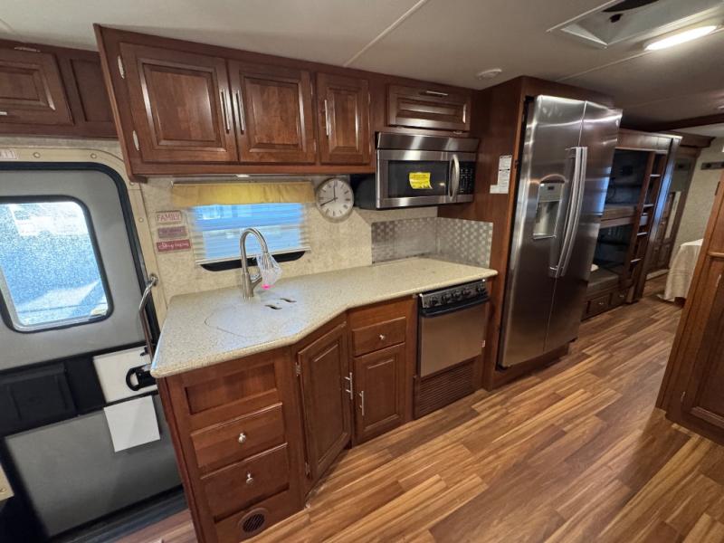 The Georgetown 351DS motor home by Forest River is unique in the fact that it offers bunk beds. The rear bedroom has a queen bed and wardrobe. On the opposite side, you will find a TV, wardrobe, and bunk bed slide.