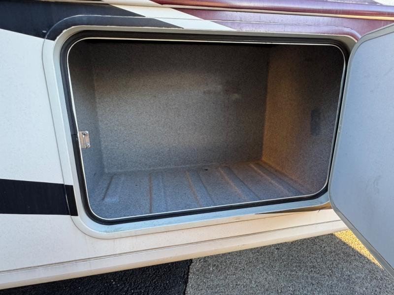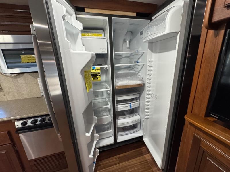 Proceeding to the front of the motor home, the kitchen offers a pantry, refrigerator or you can choose an optional residential refrigerator, three burner range, microwave, and double kitchen sink. To the right of the entry door there is a chair for your comfort. Along the opposite side there is a hide-a-bed and dinette slide. The TV is located in a nice spot so you can see it from anywhere in the kitchen and living areas.