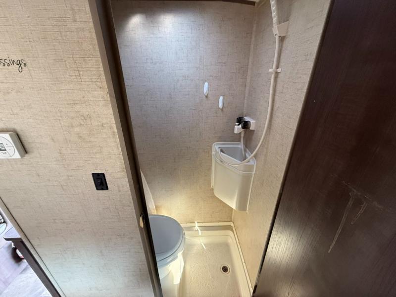 As you enter the travel trailer, to the left there is an entertainment center. The bathroom has a toilet, and a shower.