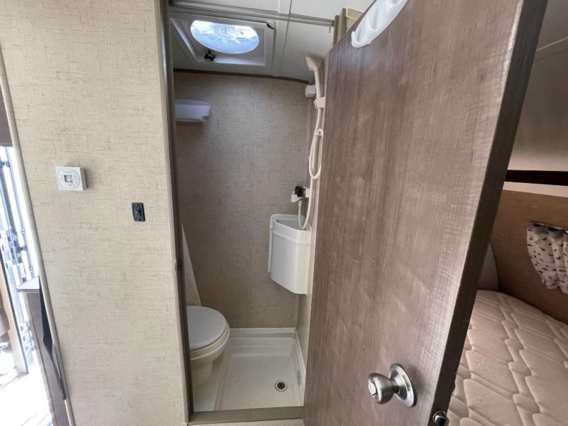 As you enter the travel trailer, to the left there is an entertainment center. The bathroom has a toilet, and a shower.