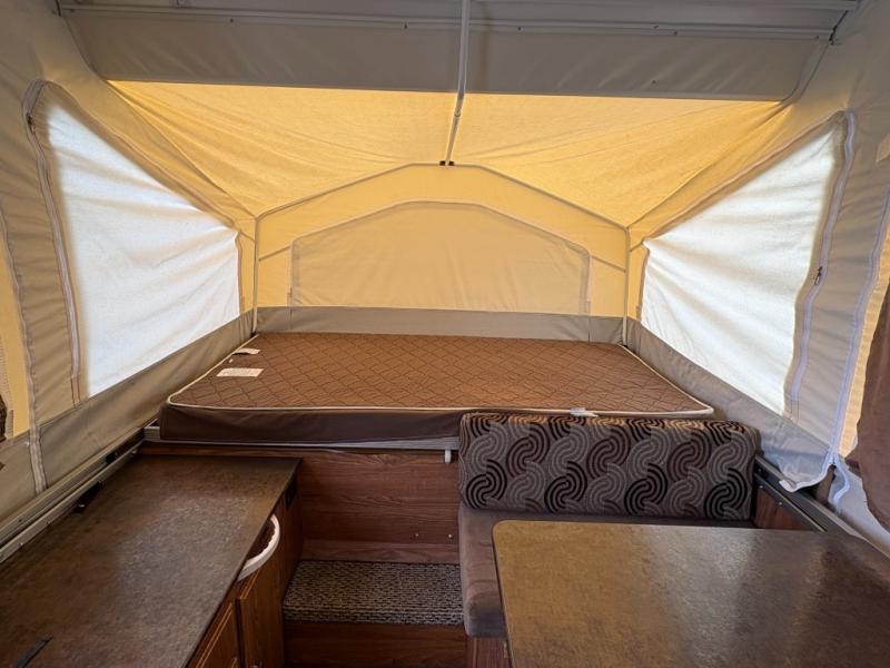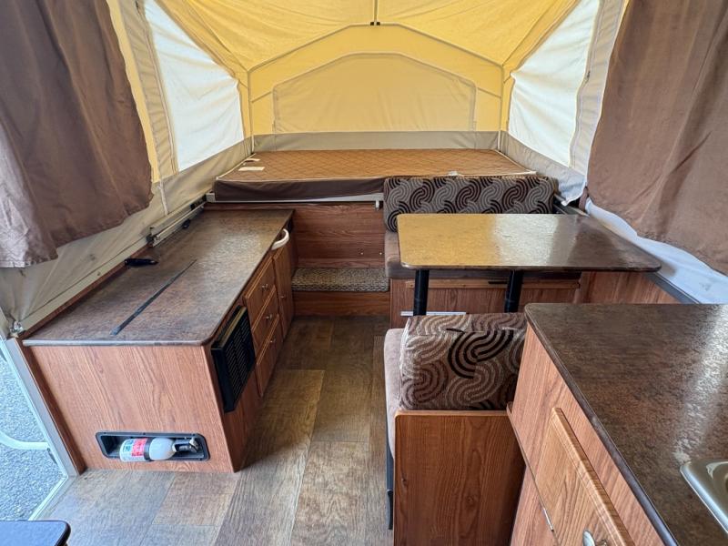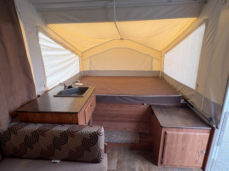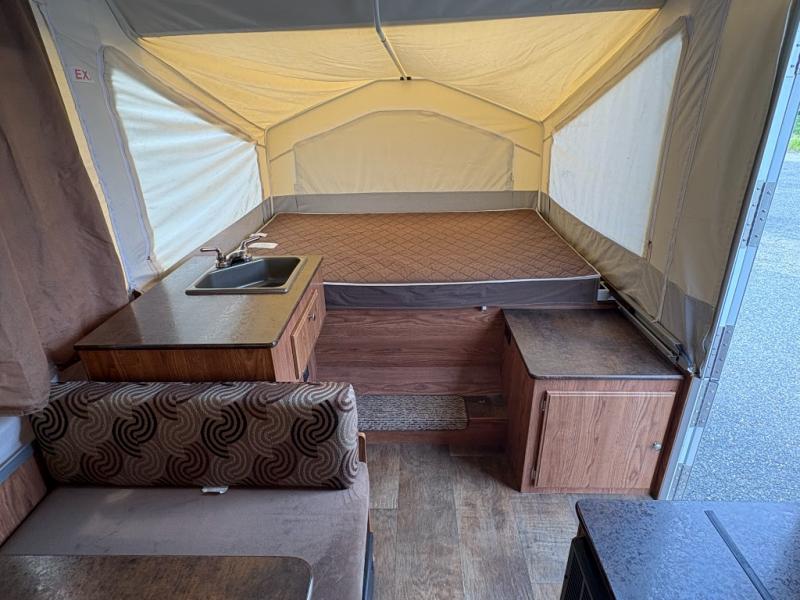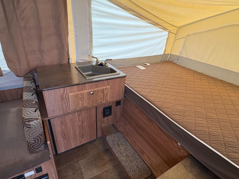 As you enter the pop-up camper, there is a cabinet to your right. A front 54 x 78 tent end bed offers comfy sleeping. Continuing around, a cabinet with a single bowl sink is in the front corner. An optional refrigerator could be included here as well. In the back corner, a 36 x 64 booth dinette also provides additional sleeping space at night.