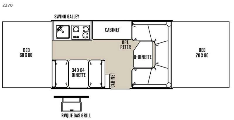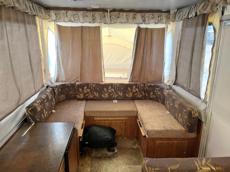 As you enter this folding pop-up camper, you will find a generous u-shaped dinette to your right.