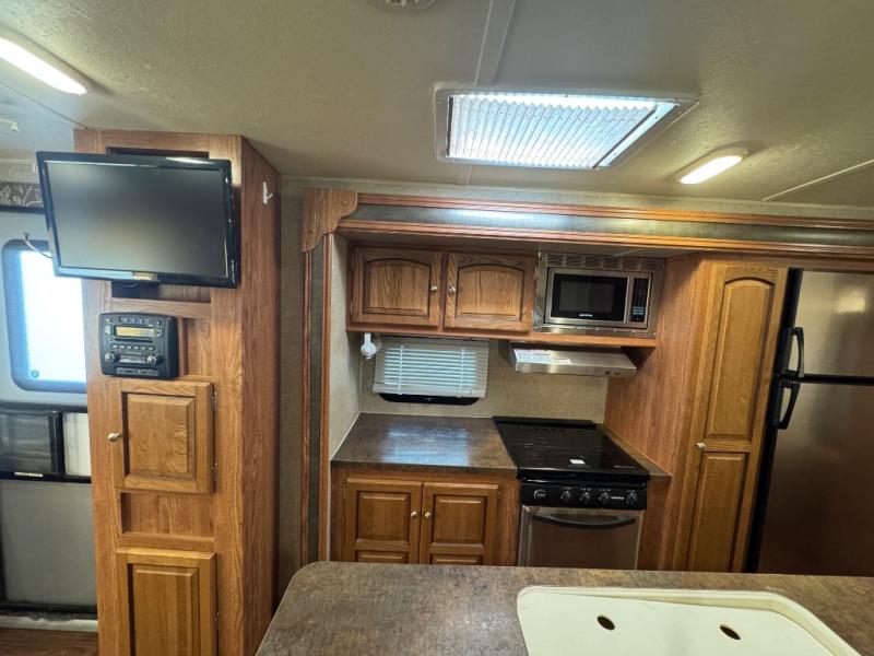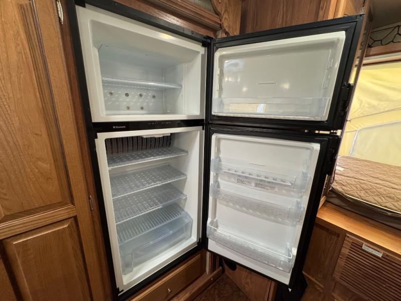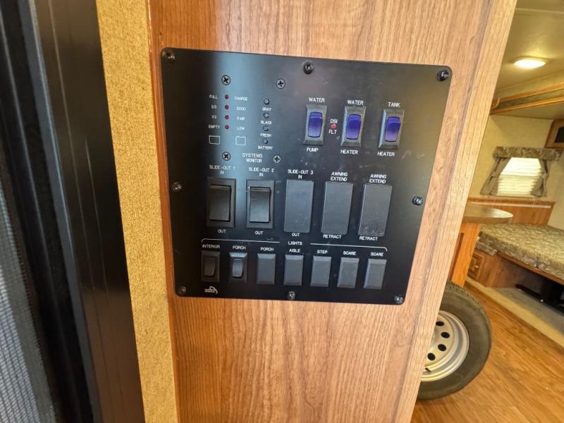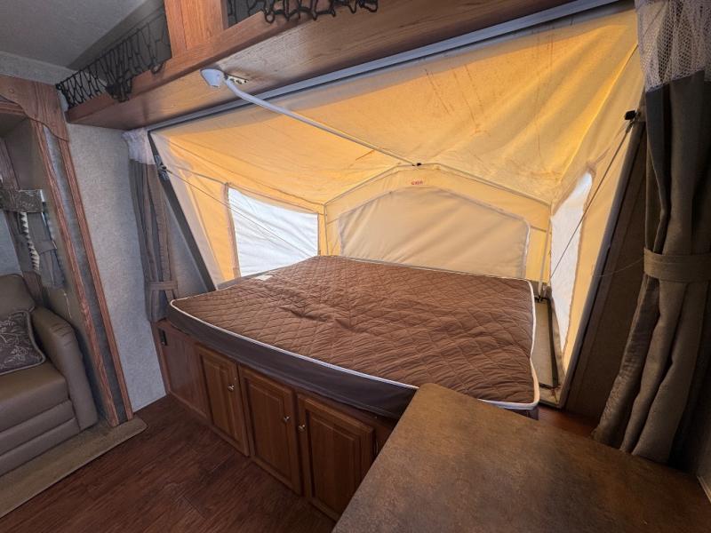 There are front and rear queen tent beds on the expandable. To the left of the entrance you will find an entertainment center. The slide offers a three burner range, microwave, extra counter space, refrigerator, and a pantry. Next to the slide there is a wardrobe and a pantry. The opposite side offers a slide with a sofa and a dinette. This expandable is unique in the fact that there is a kitchen island. The kitchen island offers extra counter space and a double kitchen sink.