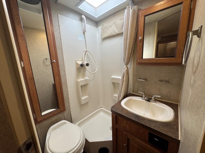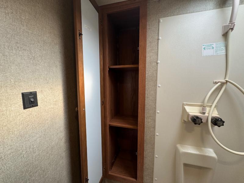 In the rear you will find a bathroom with a toilet, linen cabinet, shower, sink, and medicine cabinet.