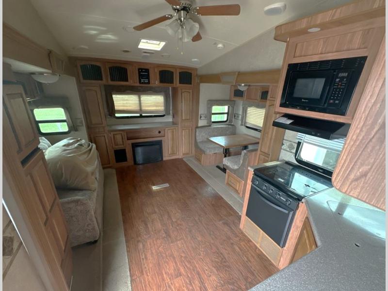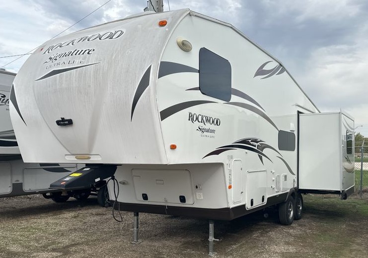 The Rockwood Signature Ultra Lite 8265WS fifth wheel by Forest River offers triple slides and a rear entertainment center.