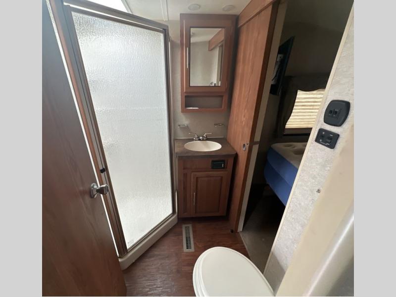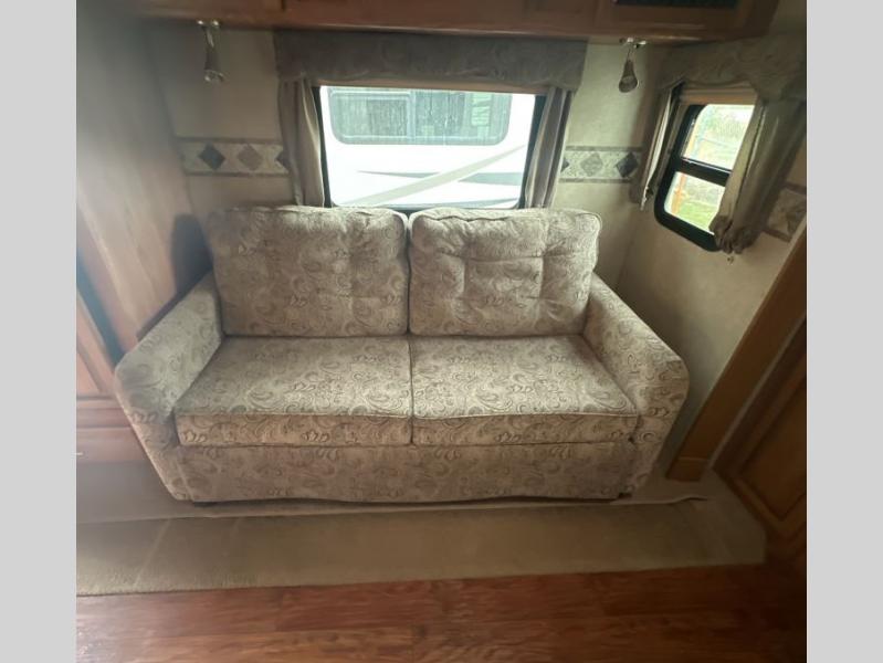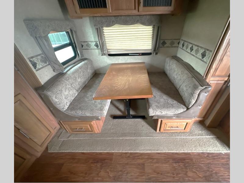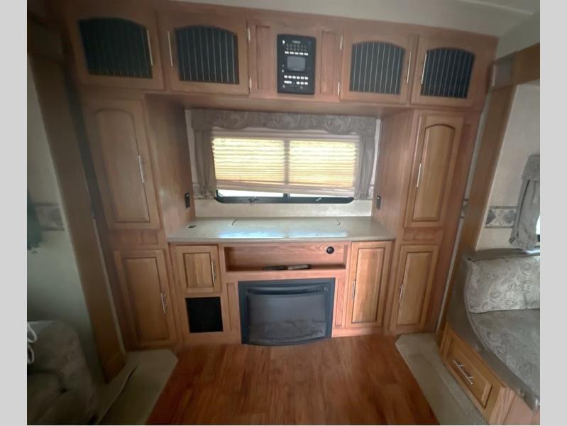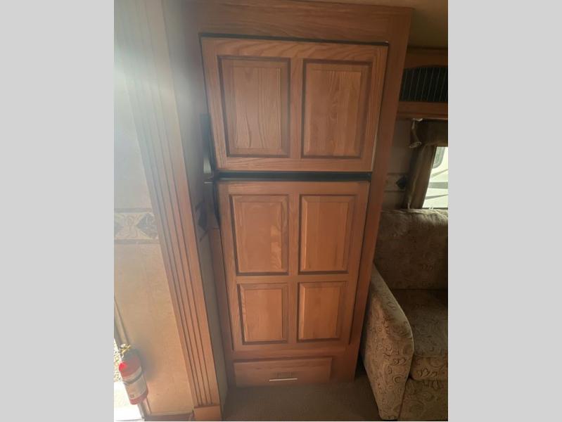 To the left of the entrance you will find a slide with a refrigerator and hide-a-bed sofa. On the opposite side there is a slide with a dinette and pantry, or an optional free-standing table. Next to the slide you will find a three burner range, microwave, and double kitchen sink. Along the rear wall there is a nice size entertainment center with a lift TV and cabinet shelves on either side.