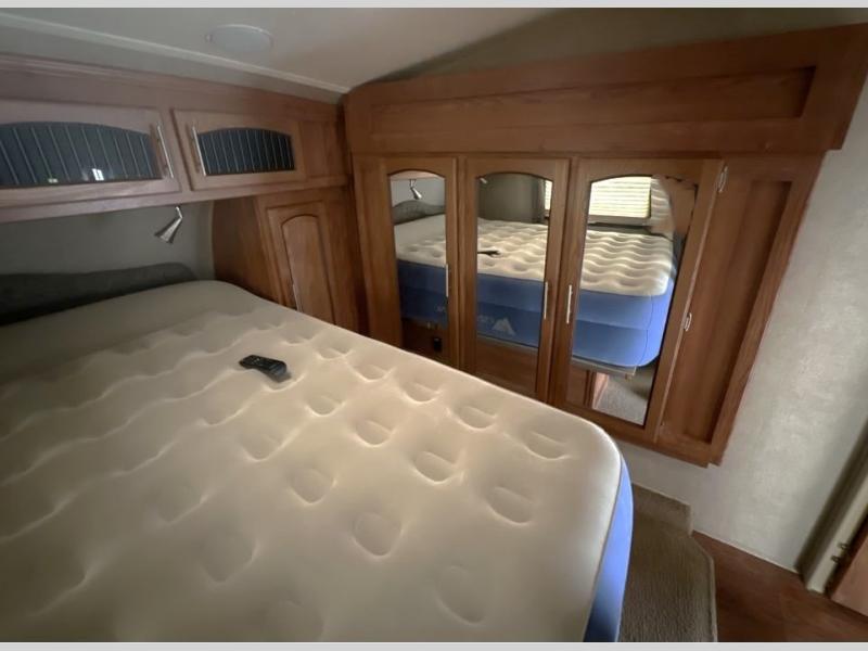 The front bedroom greets you with a queen bed and a nightstand on one side of the bed and a shirt closet on the other side of the bed. The wardrobe slide offers added storage. In the corner of the room you can even choose an optional TV.