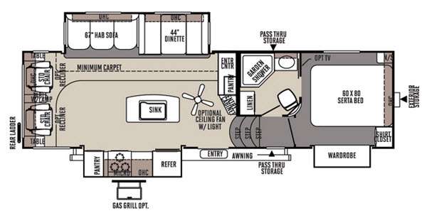 As you enter the fifth wheel, to the left is a slide with a refrigerator, three burner range, microwave, and pantry. The opposite side has a slide with a hide-a-bed sofa and dinette. In the middle of the kitchen there is a kitchen island with a large kitchen sink. In the corner of the fifth wheel you will find an entertainment center. In the very rear of the fifth wheel are two lounge chairs and an end table with a lamp, or you can choose optional recliners.