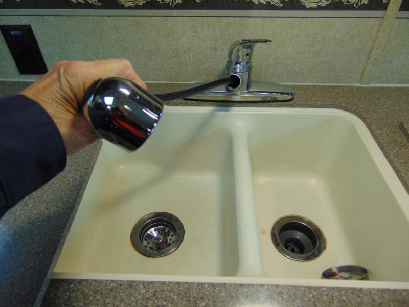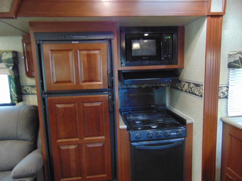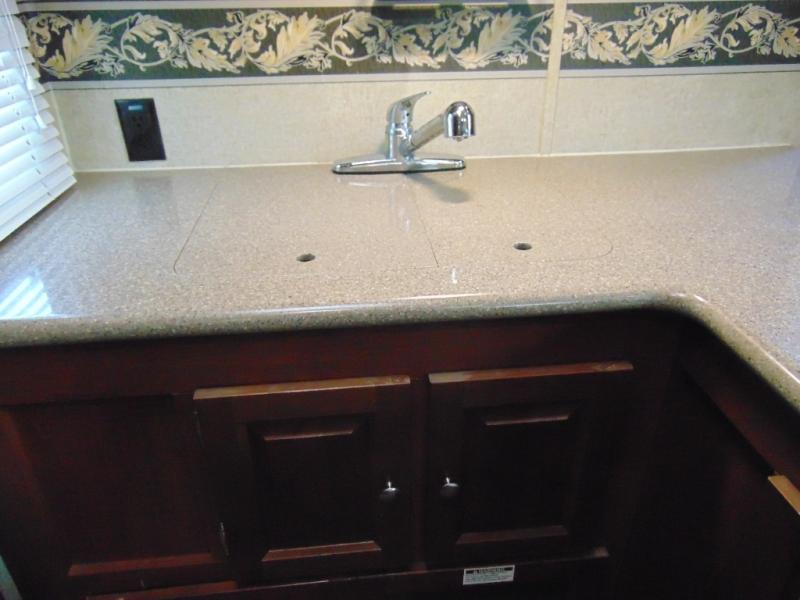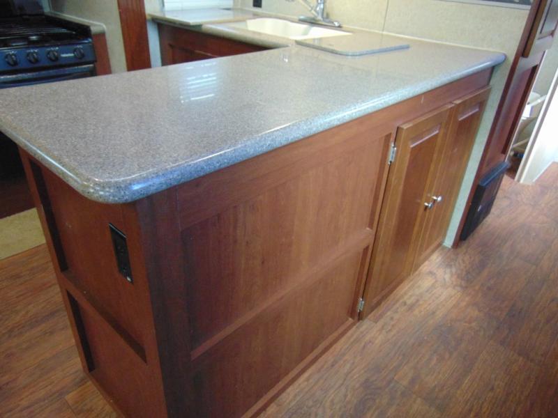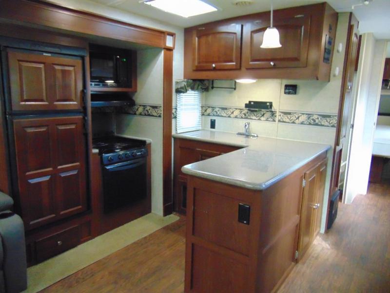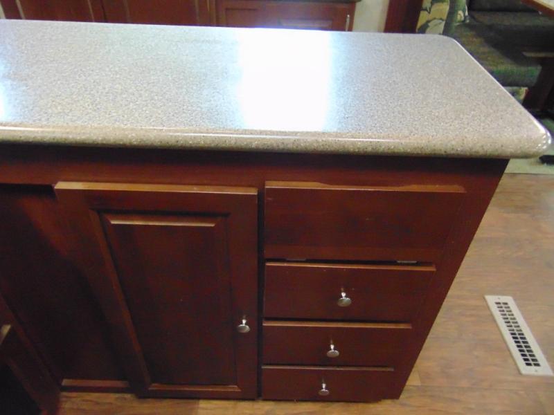 To the left of the entrance you will find a large pantry, and a slide with a king u-dinette or an optional free standing table and chairs. Along the rear wall there is an entertainment center. The other slide offers a hide-a-bed sofa, refrigerator, three burner range, and microwave. Next to the slide there is a double kitchen sink, L-shaped counter and an optional counter top extension.