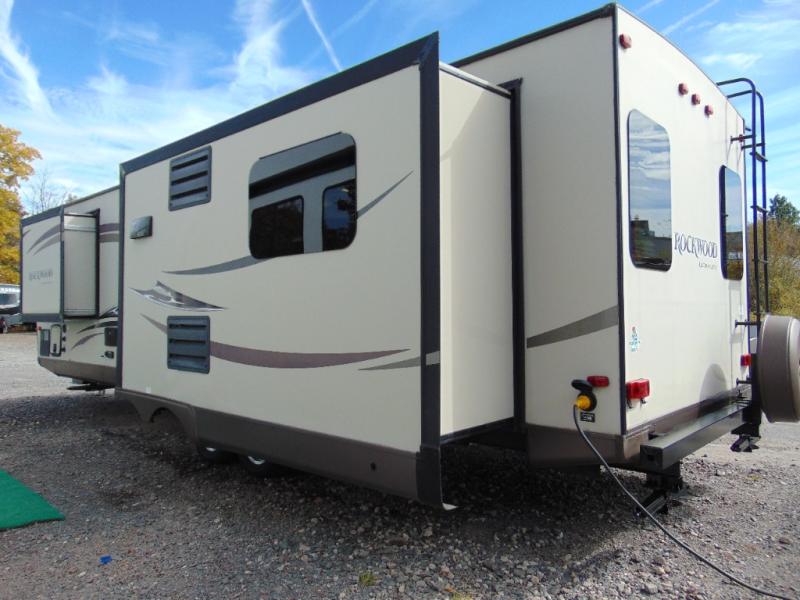 The Rockwood Ultra Lite 2703WS travel trailer offers a rear entertainment center and triple slides.