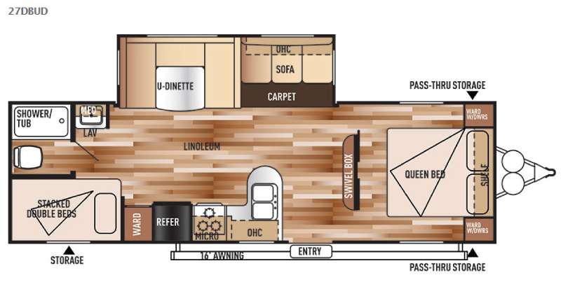 The Salem 27DBUD travel trailer by Forest River offers a single slide and a rear set of stacked double beds.