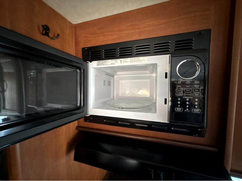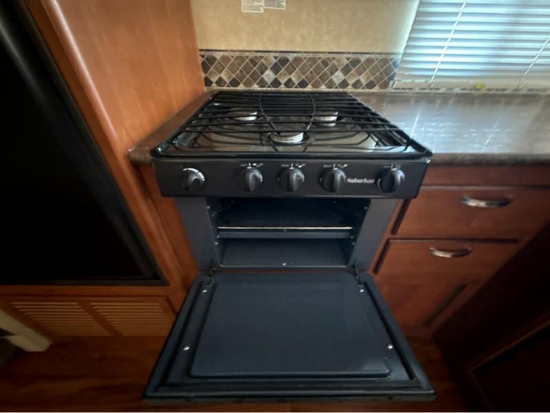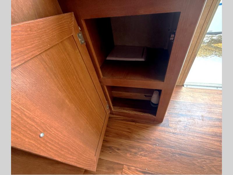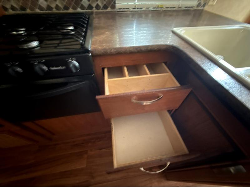 As you enter the travel trailer, along the rear wall you will find a refrigerator, three burner range, microwave, and double kitchen sink. The slide offers a pantry, sofa, and wardrobe. On the opposite side of the trailer there is a dinette.