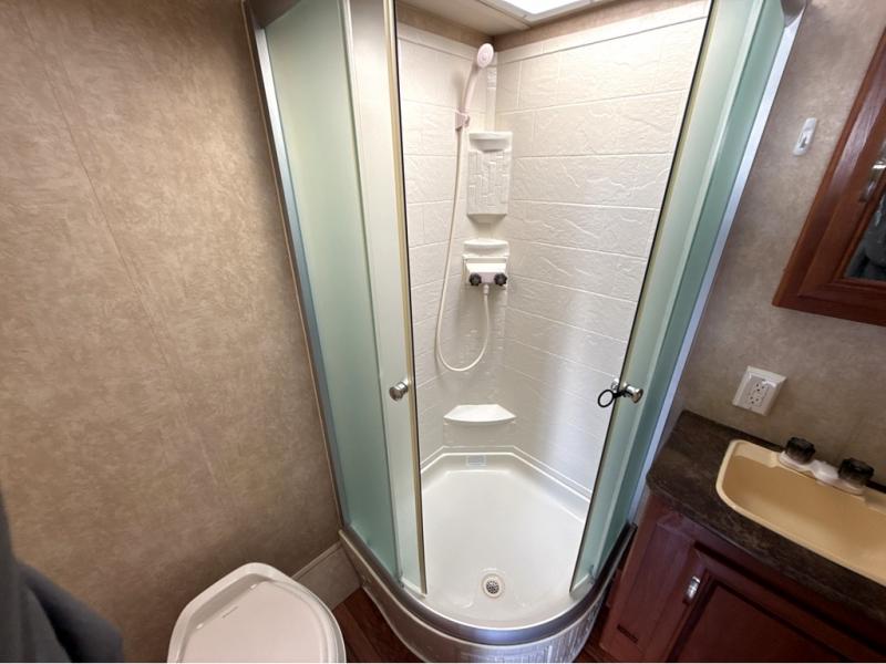 In the bathroom you will find a sink, medicine cabinet, corner shower, and toilet.