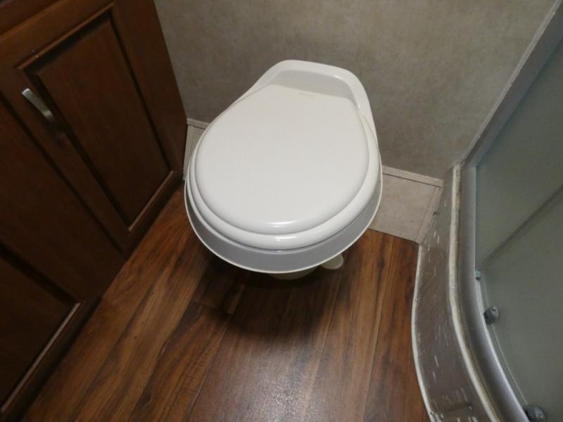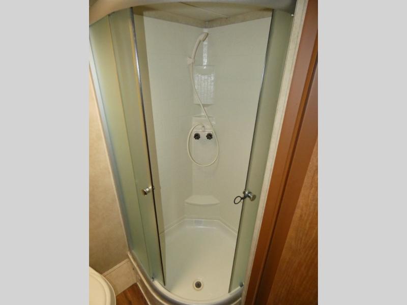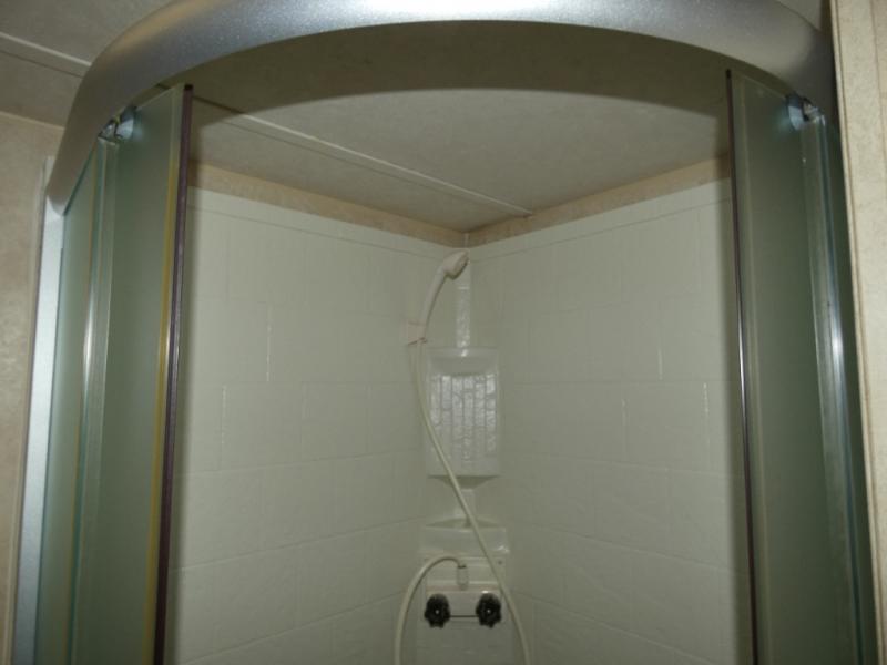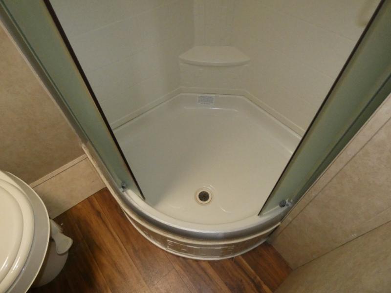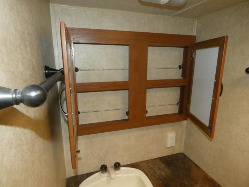 In the rear of the trailer you will find a bathroom with a neo-angle shower, toilet, sink, and medicine cabinet.