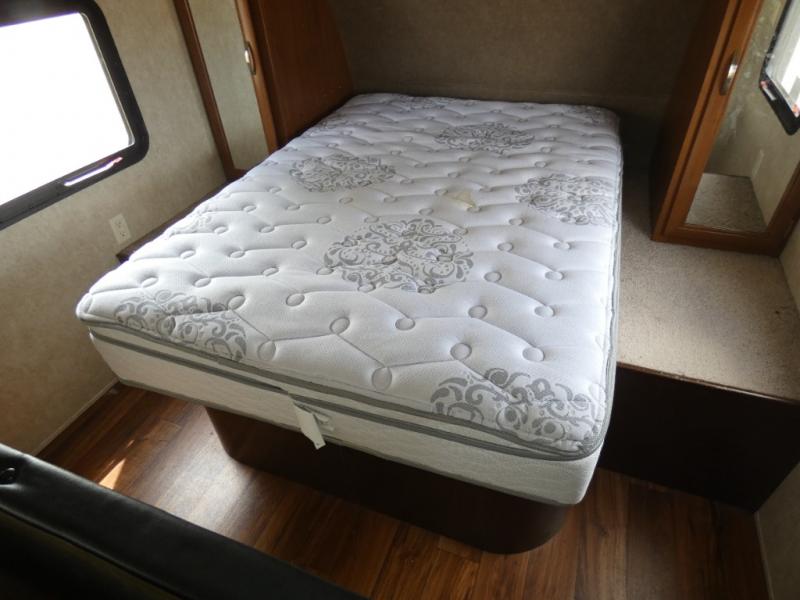There are plenty of overhead cabinets throughout the travel trailer, so you can bring all of your necessary items from home. Under the bedroom area there is a pass thru storage area.