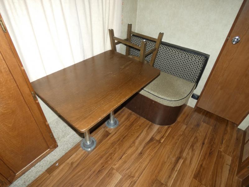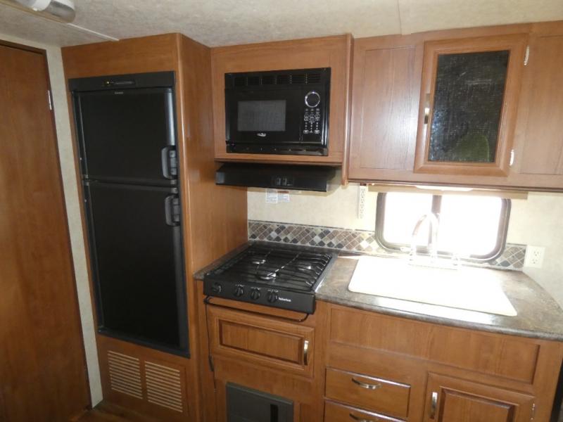 As you enter the travel trailer, to the left there is a dinette. On the opposite side of the trailer you will find a refrigerator, three burner range, microwave, and double kitchen sink. There is also a sofa in the main living area.
