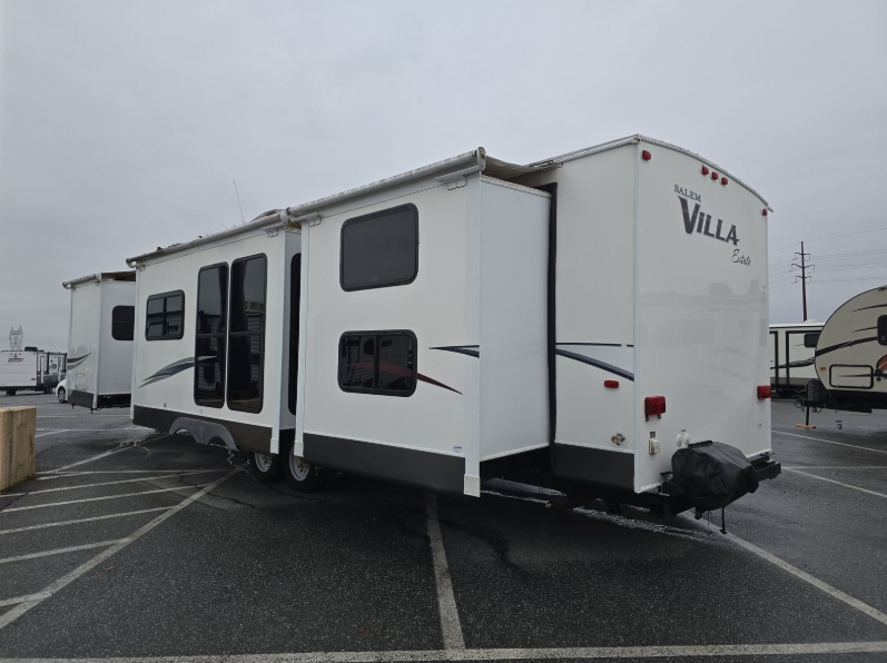 The Salem Villa Estate 404X4 destination trailer by Forest River offers quad slides and a rear bunk house.