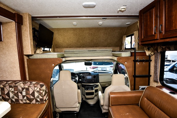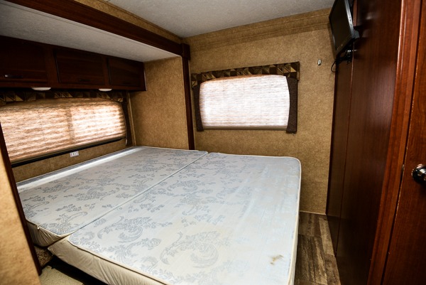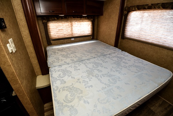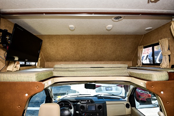 There is a generous 60" x 80" over cab bunk mat and storage included. You may choose optional cabinets with a 42" TV or an optional 32" TV with twin beds in place of the 60" x 80" bunk.