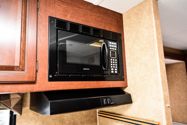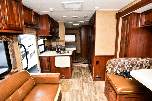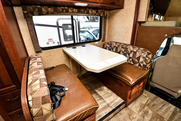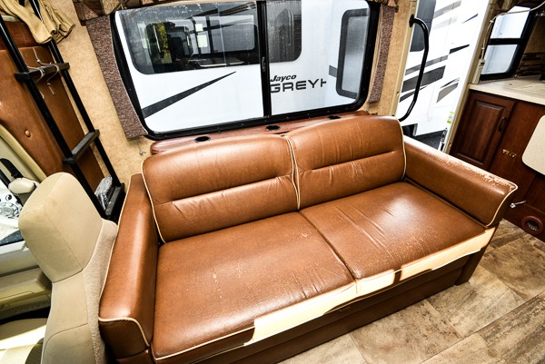 A second slide has u-dinette, or you can choose an optional dream dinette, and overhead cabinets. Across from the slide, you will find a sofa and overhead cabinets.