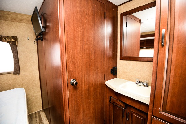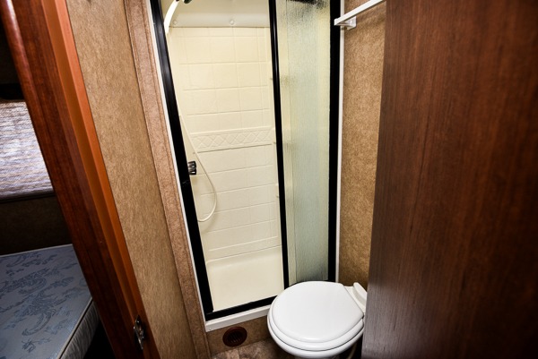 The bathroom is also opposite the bed. There is a private toilet area and shower. Just outside that area, you will find a vanity sink, medicine cabinet and wardrobe.
