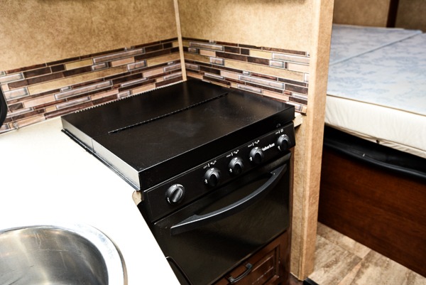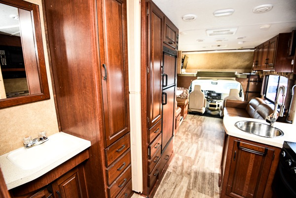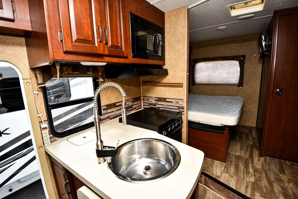 The kitchen includes a combination wardrobe/pantry and a refrigerator on one wall with a stove, overhead microwave and cabinets, single bowl galley sink, and drop down counter on the opposite wall.