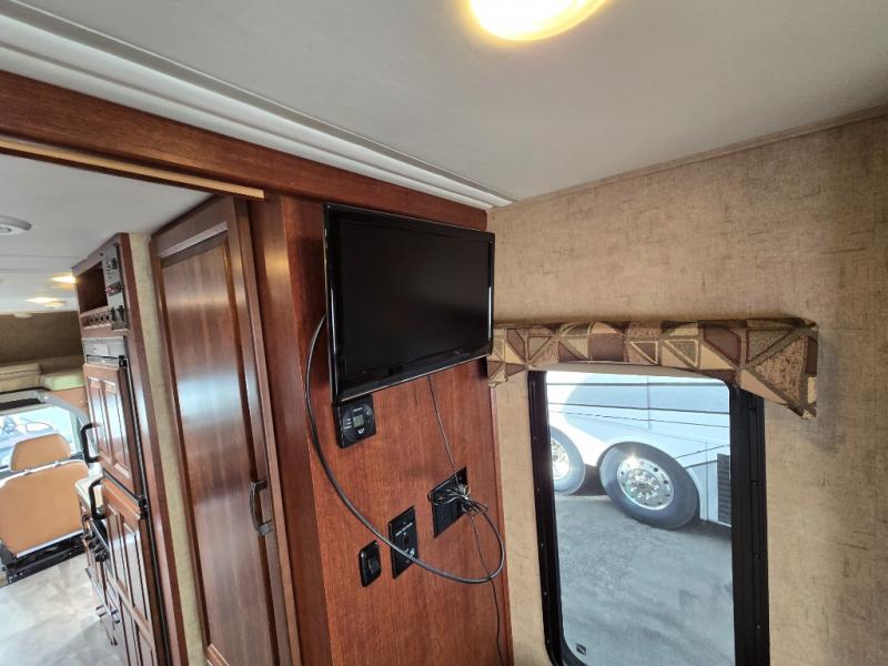 As you enter the motor home, above the cab you will see a 54" x 80" bunk or you can choose an optional entertainment center. In the corner of the cab there is a 32" TV.