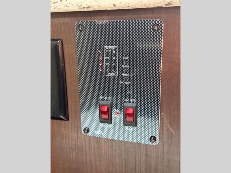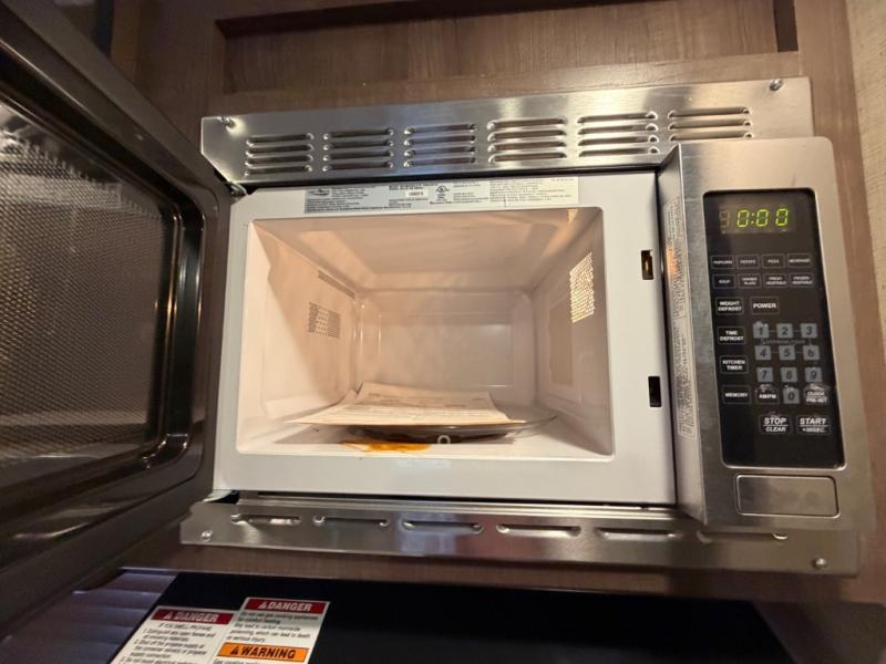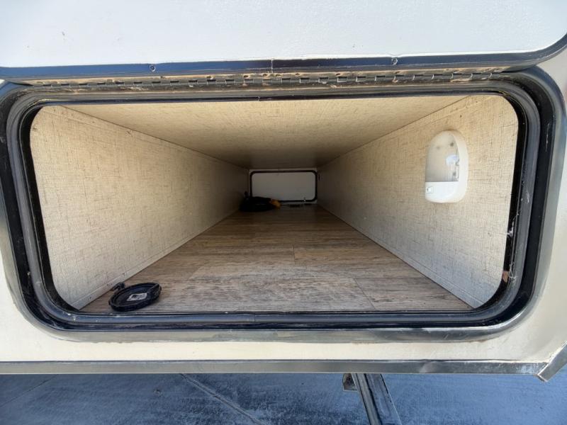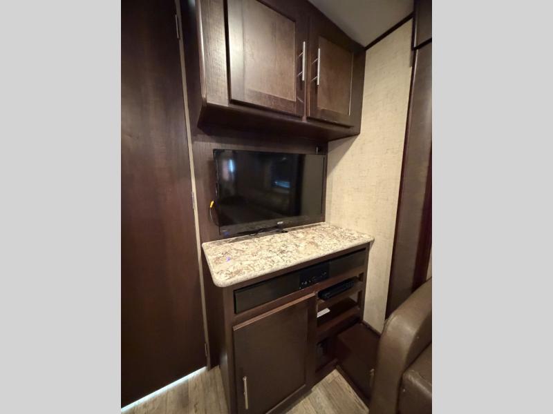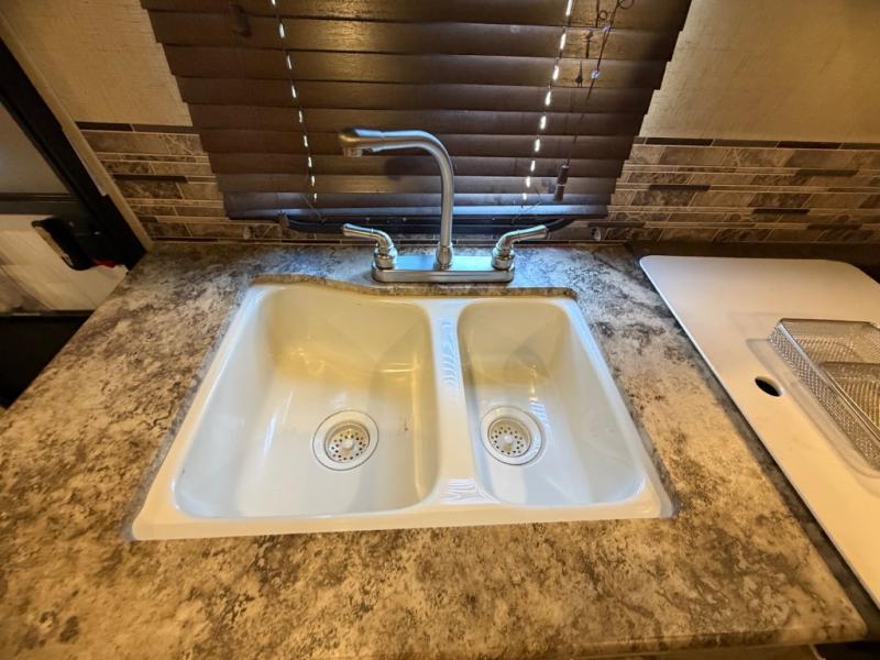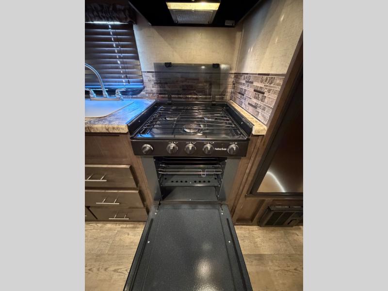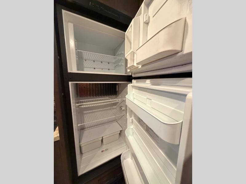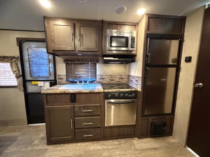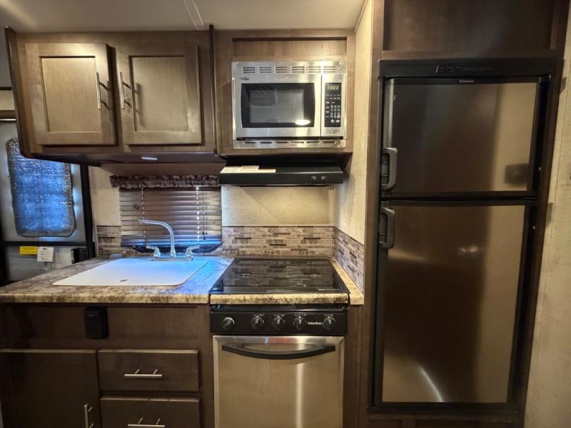 As you enter the travel trailer, to the left is a double kitchen sink, three burner range, and refrigerator. The opposite side of the travel trailer has a sofa slide with a table and next to the slide a nice entertainment center.