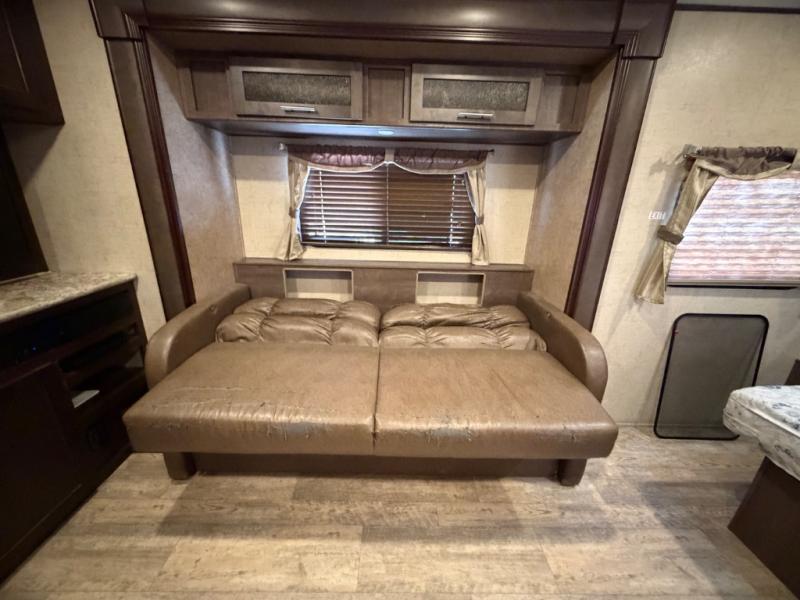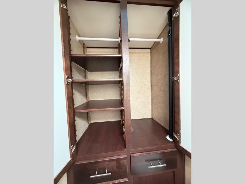 The queen bed is located in the front. Below the bed you will find plenty of storage with the super storage center. There are also wardrobes on either side of the bed.