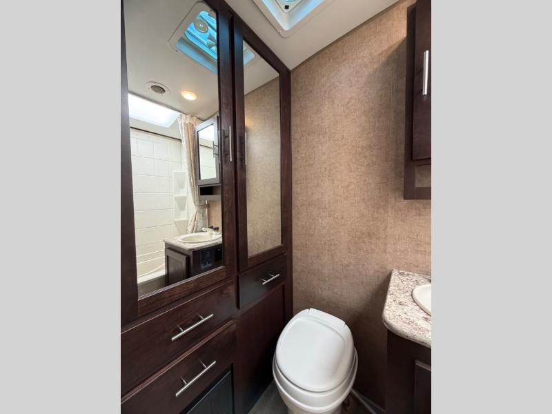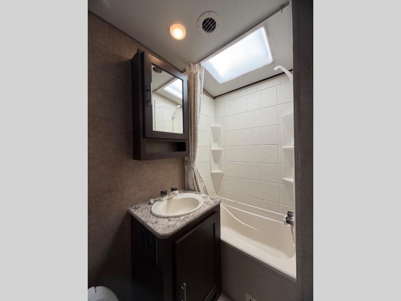In the rear of the travel trailer you will find the bathroom. The bathroom has a tub/shower, toilet, sink, and bath closet.