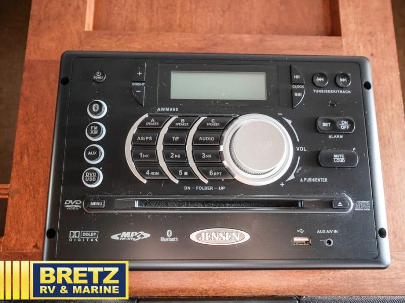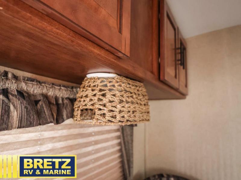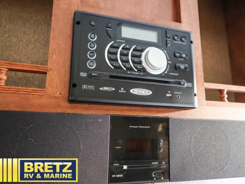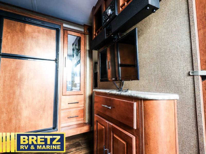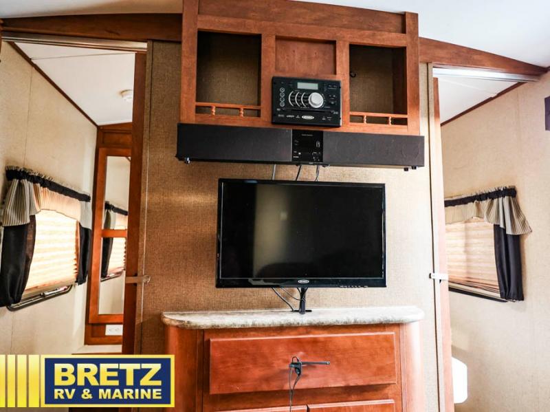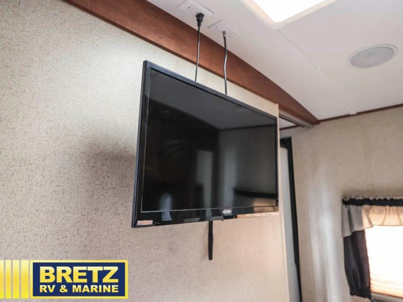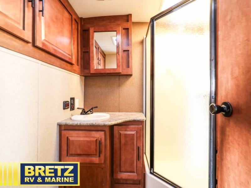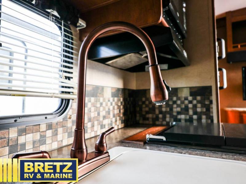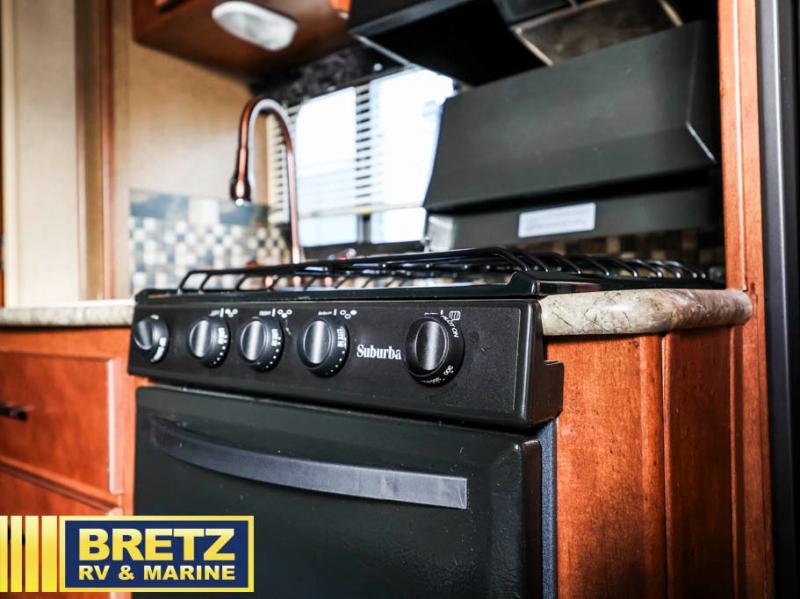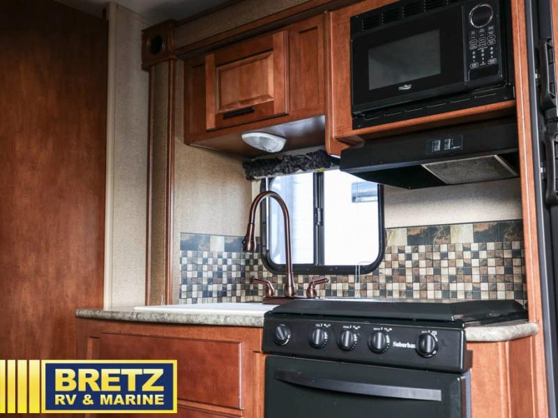 As you enter the travel trailer, to the left is a u-dinette. The opposite side of the trailer has a slide with a pantry, refrigerator, three burner range, and double kitchen sink. Along the front of the living area you will find an entertainment center.