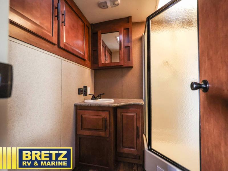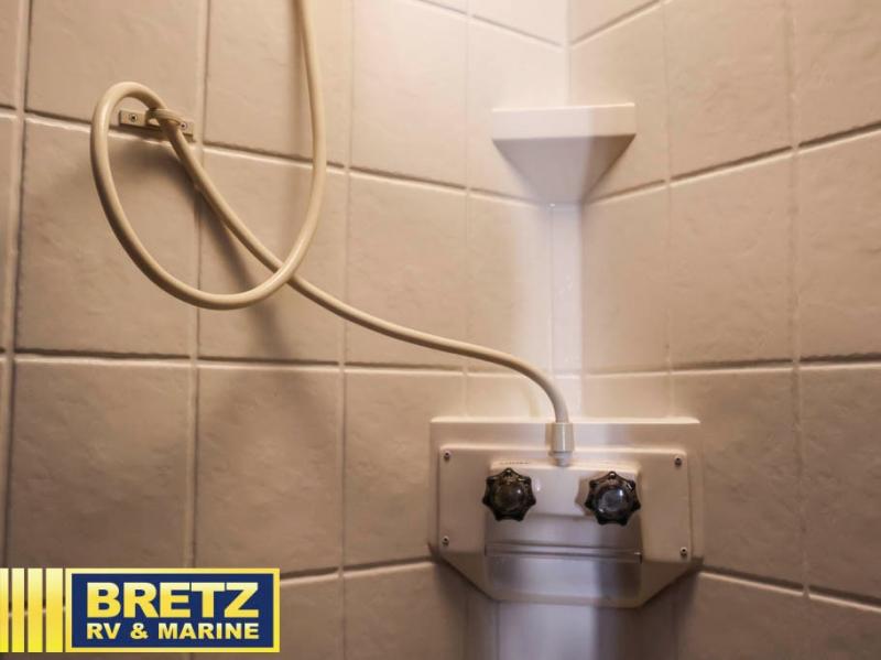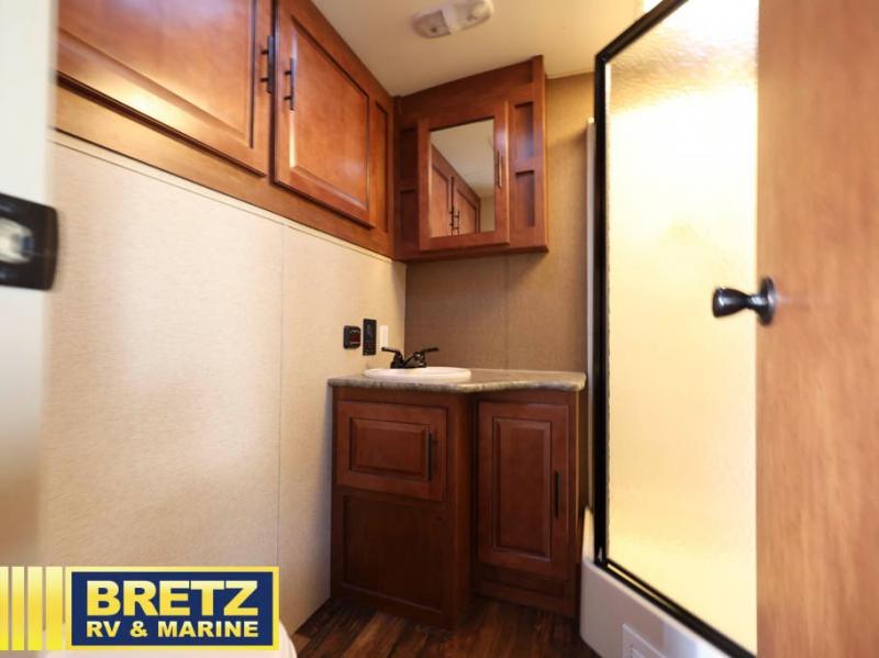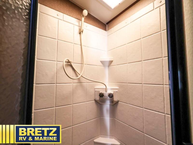 In the rear, you will find the bathroom. The bathroom offers a closet, neo-angle shower, sink, and toilet.