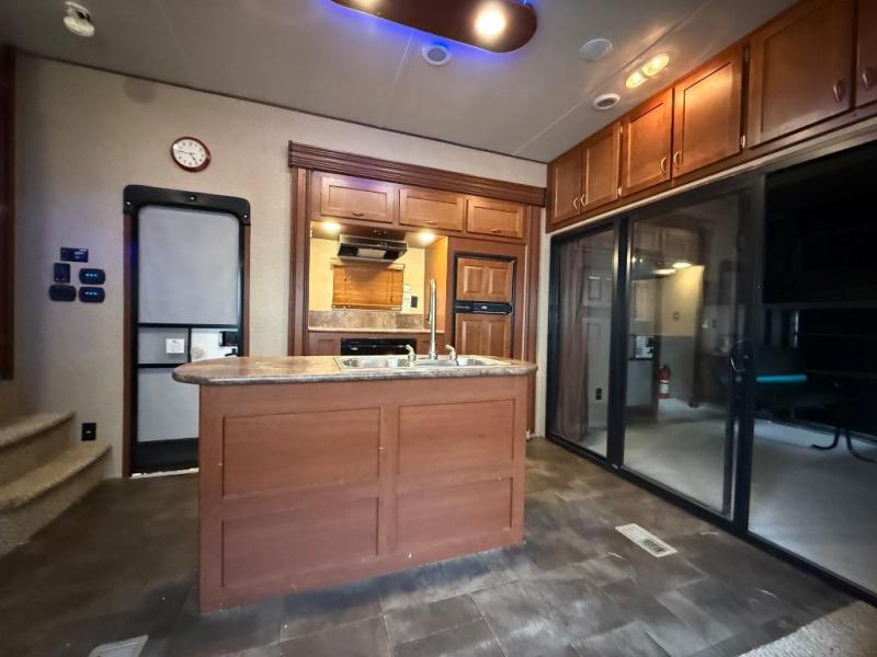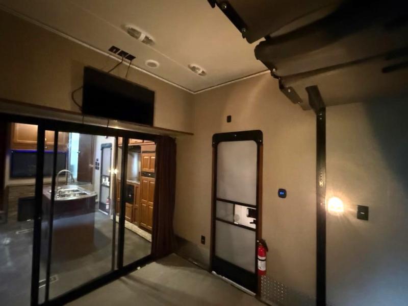 The 377V Vengeance toy hauler fifth wheel by Forest River offers much room for friends and family with a cargo area, loft, and front bedroom, and also features a bath and a half.
