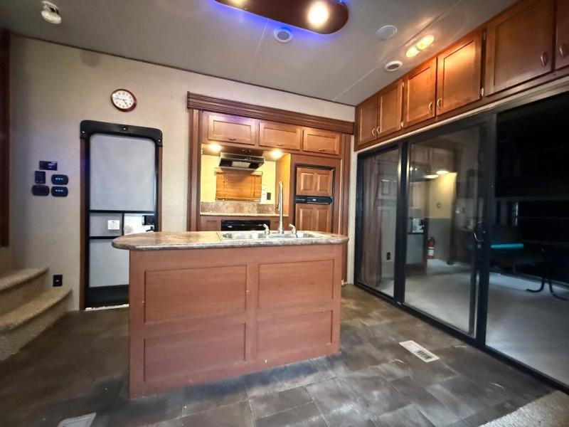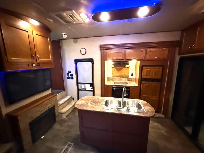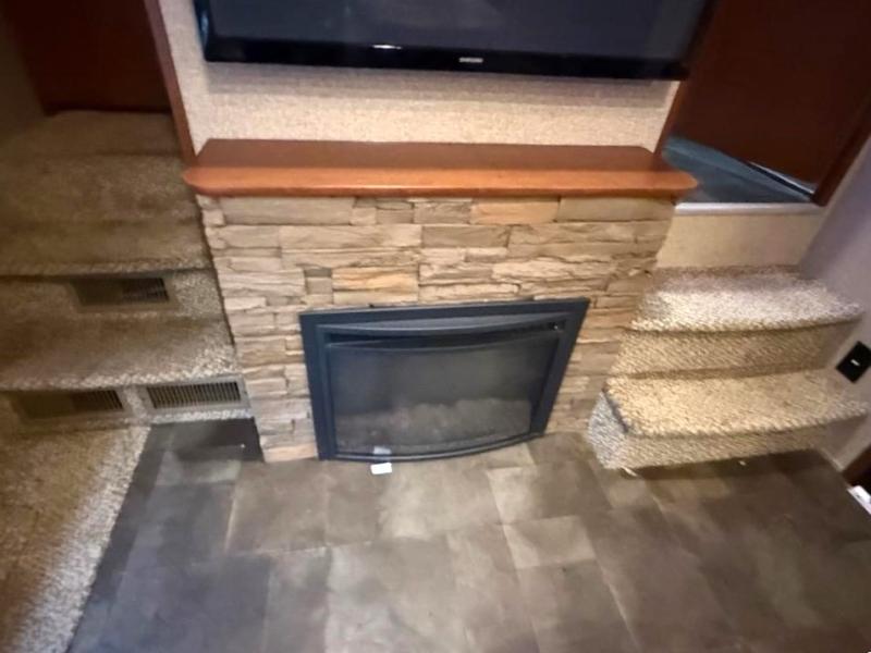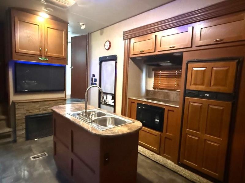 The kitchen and living area offer two slides. The first slide has a refrigerator, three burner range, and microwave. You will find the kitchen island a huge help with the double kitchen sink and extra counter space. The other slide has a sofa with recliners. You can enjoy relaxing on the sofa while viewing the entertainment center and fireplace.