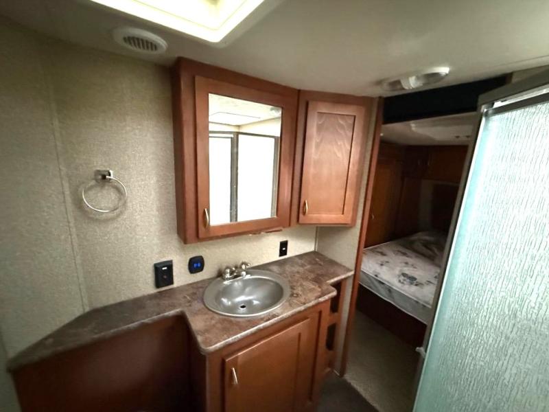 Living / Kitchen Area: Mid-unit slide-outs significantly enlarge the living area. Includes a well-equipped kitchen with full-size refrigerator, three-burner range with oven, microwave, pantry, and solid-surface countertops. The dining table typically sits adjacent to slide for cozy meals.