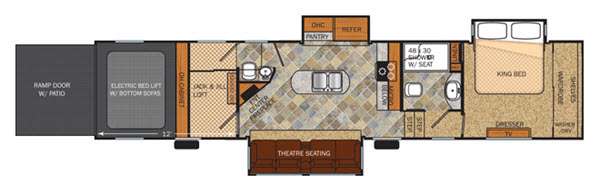 In the cargo area you will find a ramp door with patio, an electric bed lift with bottom sofas.